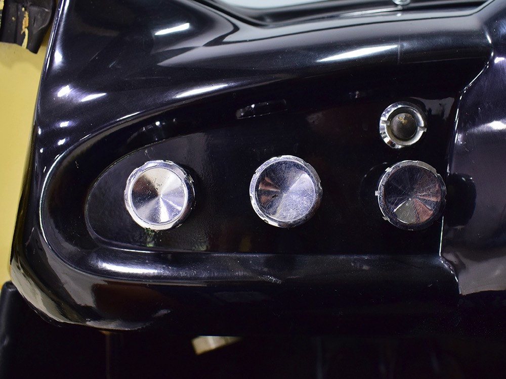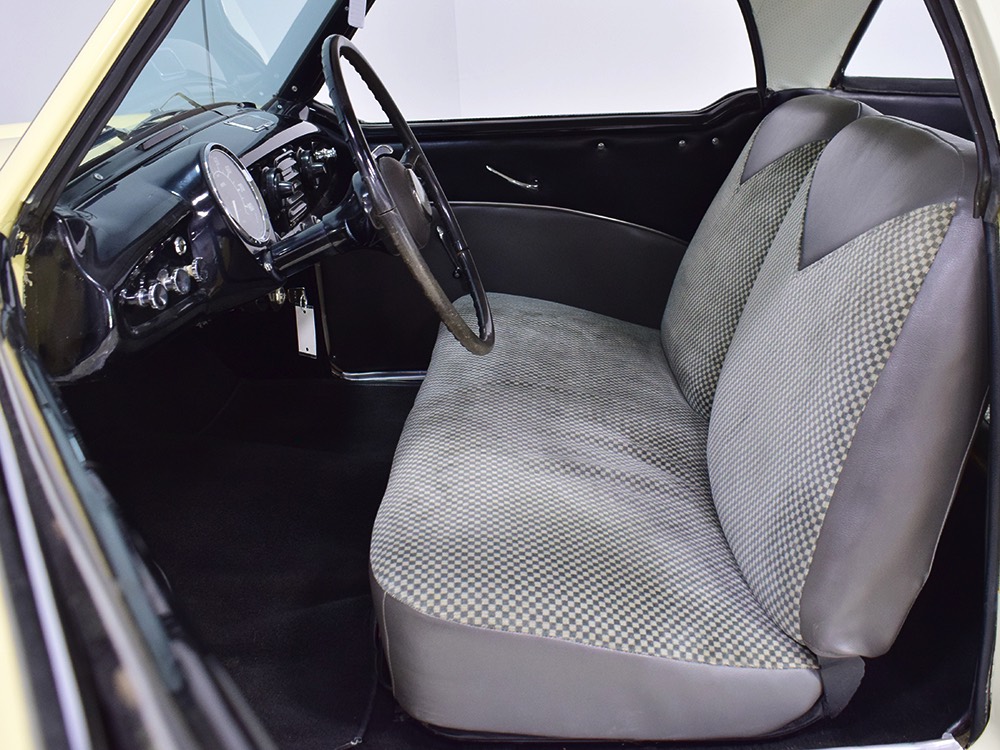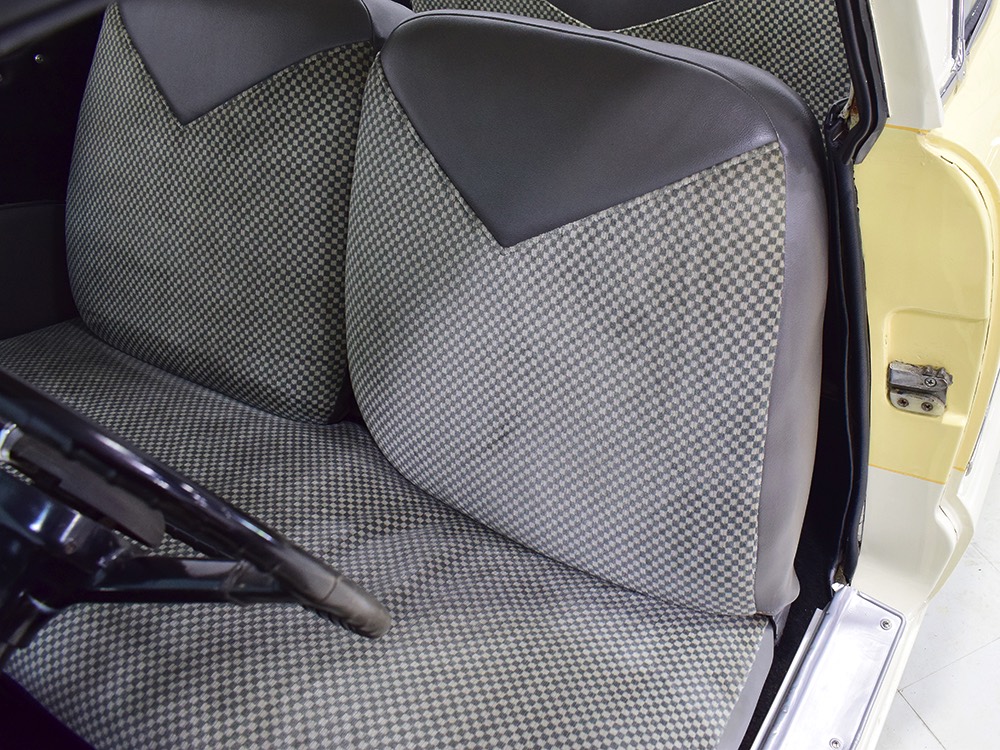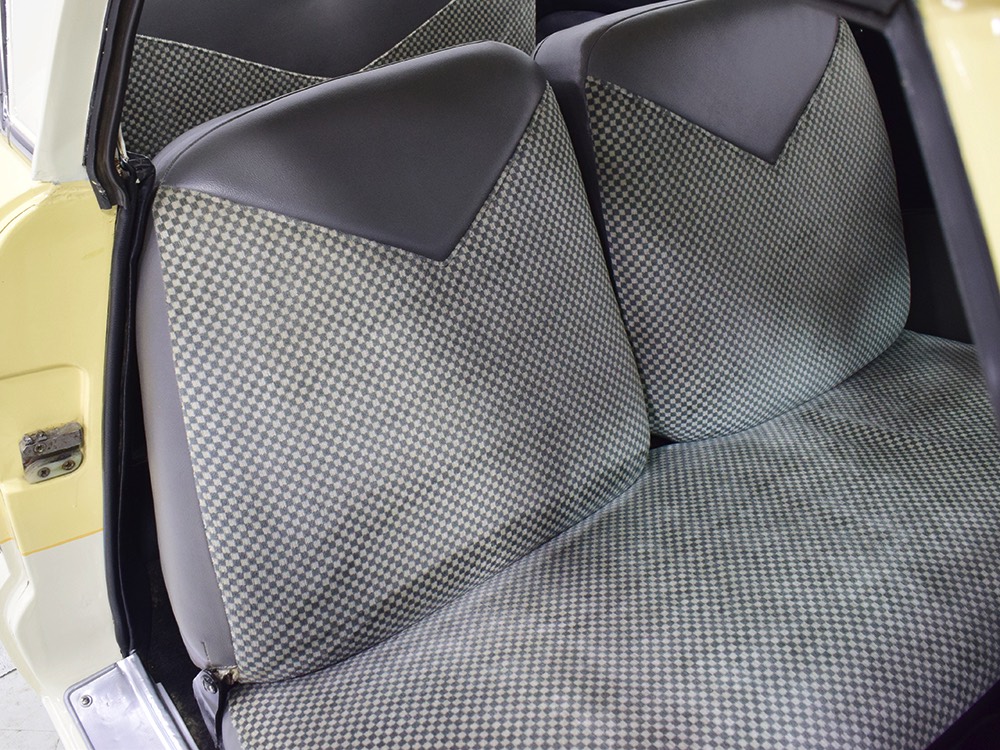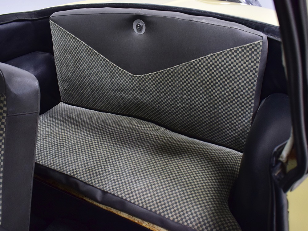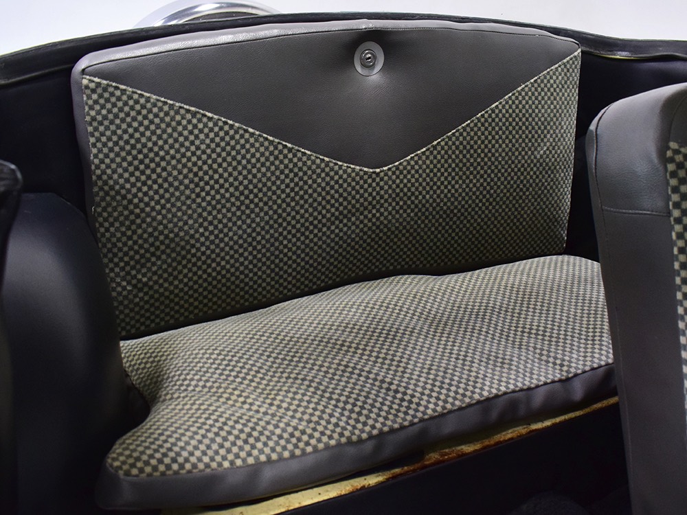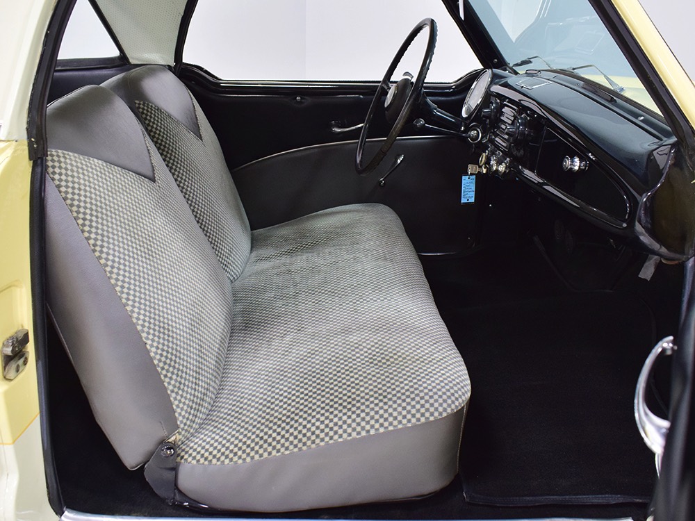 The car is small, no question about it, but you’ll find that it’s easy to get comfortable inside where there’s lots of room for two. The split bench seat has been upholstered in original style checkered fabric with vinyl accents, and legroom is good, even for six-footers. Dramatic black and gray door panels almost look like modern art and the black dashboard is handsome as well as functional. All the relevant instruments are clustered ahead of the driver, with secondary controls just underneath along with the unusual 3-speed shifter that looks odd but feels intuitive in use. The original AM radio is neatly integrated into the dash just above the ignition and offers big, easy-to-use knobs, although it is sadly not functional. New black carpets help it feel comfortable and quiet inside and while there's a back seat, it's probably best for storage or small children. With the spare tire stowed on the outside of the bodywork, the trunk will easily swallow a weekend’s worth of luggage and access is by tilting the rear seat back down. There’s also a jack assembly, just in case.