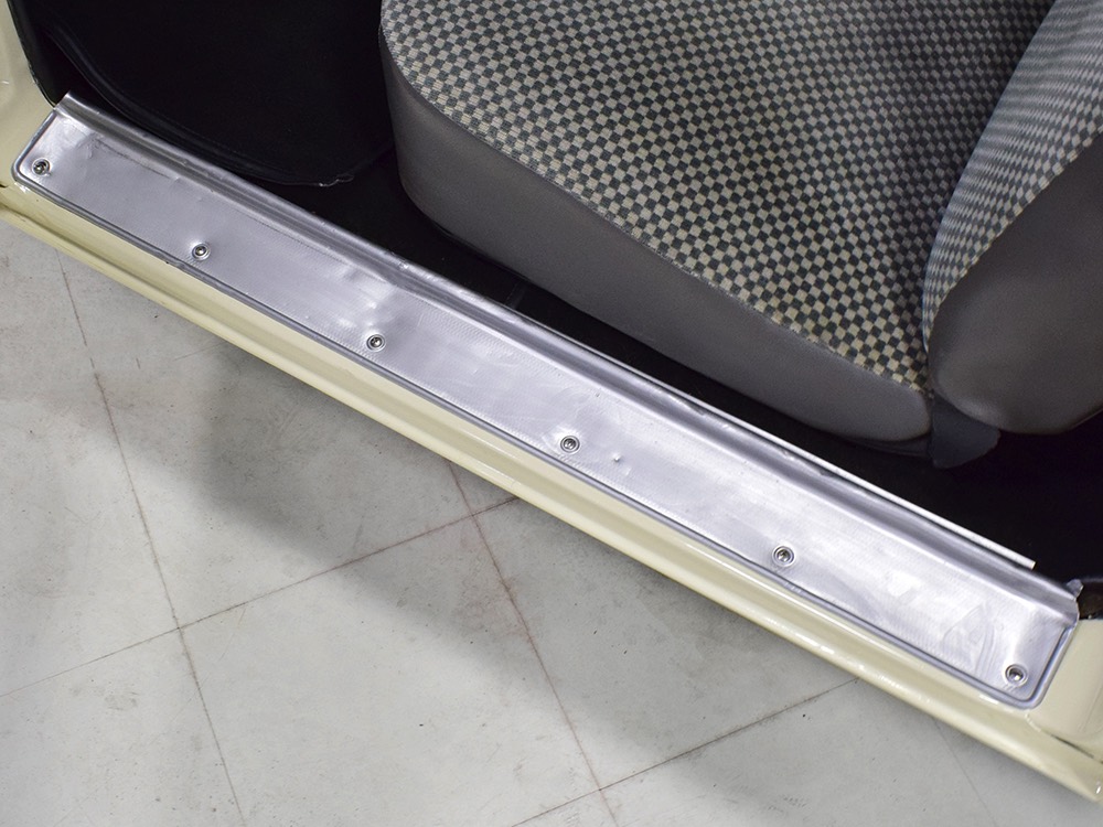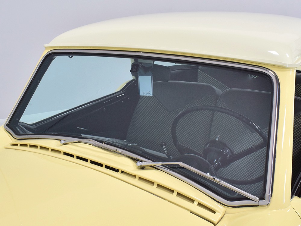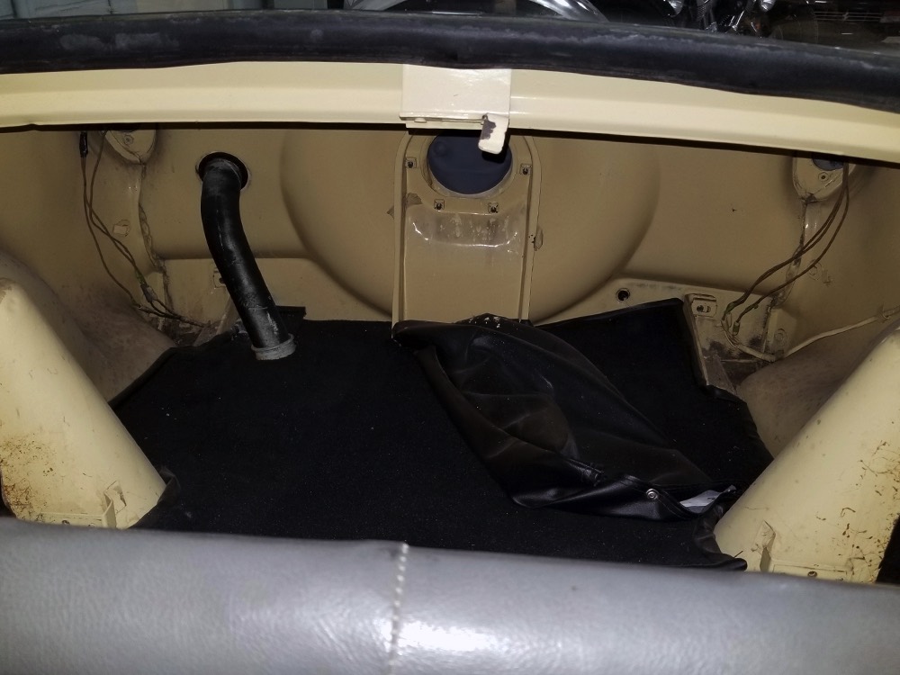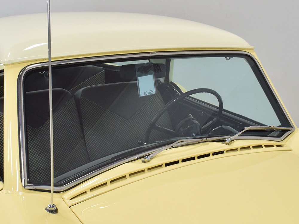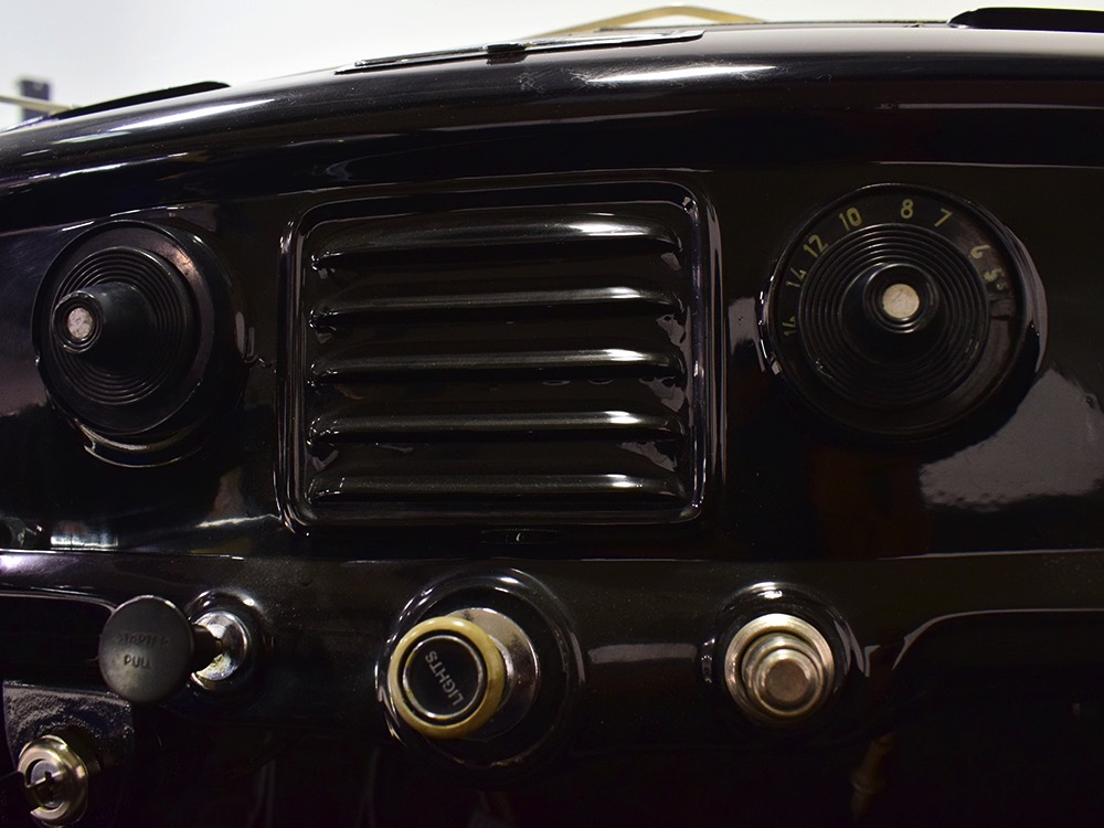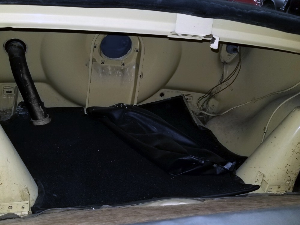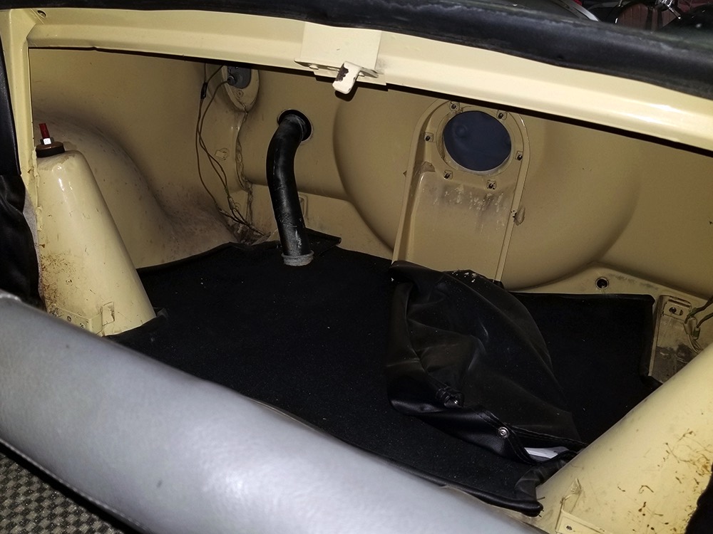 The car is small, no question about it, but you’ll find that it’s easy to get comfortable inside where there’s lots of room for two. The split bench seat has been upholstered in original style checkered fabric with vinyl accents, and legroom is good, even for six-footers. Dramatic black and gray door panels almost look like modern art and the black dashboard is handsome as well as functional. All the relevant instruments are clustered ahead of the driver, with secondary controls just underneath along with the unusual 3-speed shifter that looks odd but feels intuitive in use. The original AM radio is neatly integrated into the dash just above the ignition and offers big, easy-to-use knobs, although it is sadly not functional. New black carpets help it feel comfortable and quiet inside and while there's a back seat, it's probably best for storage or small children. With the spare tire stowed on the outside of the bodywork, the trunk will easily swallow a weekend’s worth of luggage and access is by tilting the rear seat back down. There’s also a jack assembly, just in case.