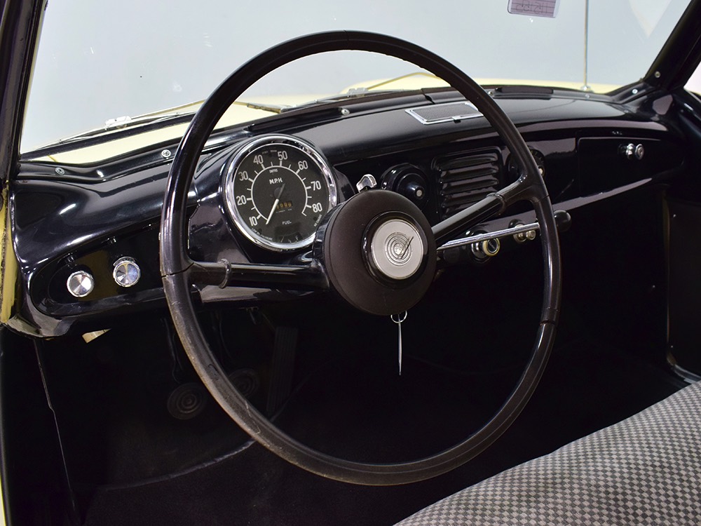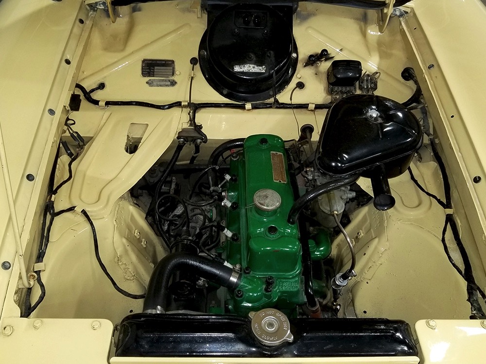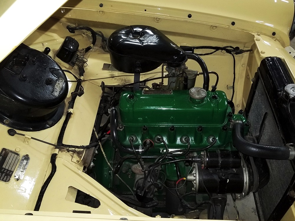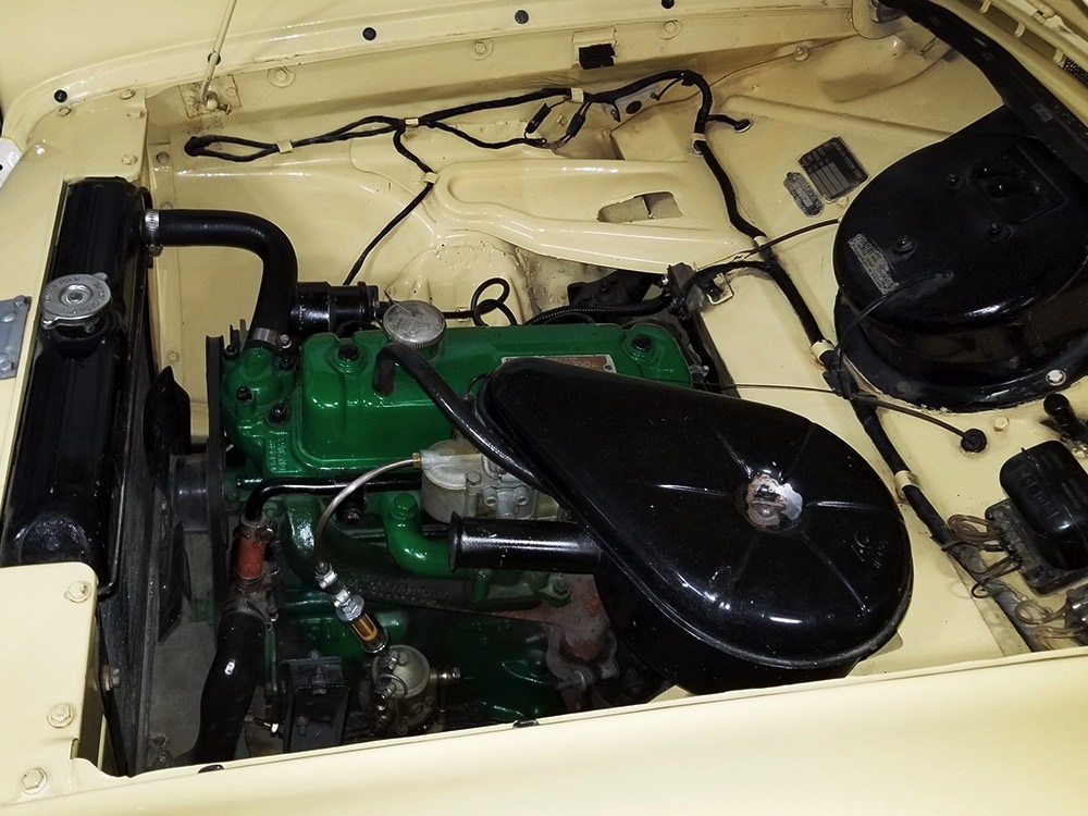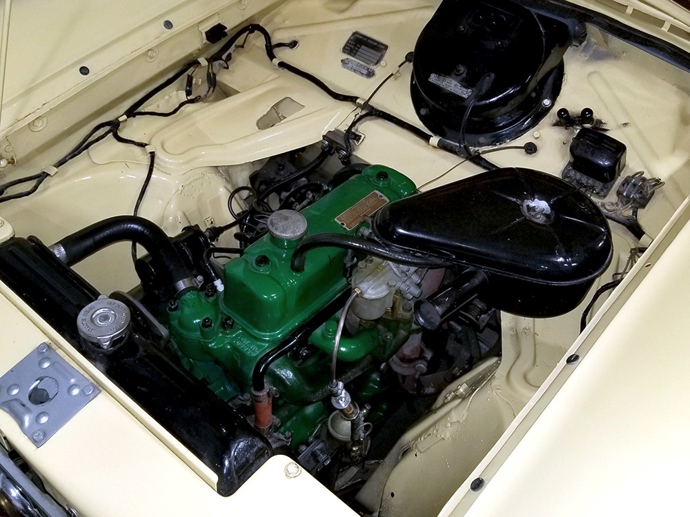 The Austin A90 donated its 1.5-liter four-cylinder engine making 50 horsepower and enough torque to feel peppy around town. Bearing in mind the car’s modest size and weight, performance is energetic and you’ll find yourself zipping around corners, one of the many benefits of the lightweight design. The engine has been rebuilt and detailed, with bright green paint on the engine itself and properly finished accessories around it. A 1-barrel Zenith carburetor handles induction chores and a reproduction exhaust system gives it an authentic sound that’s sporty without being annoying. Service work included a tune-up, so it starts easily, idles well, and doesn’t have any hiccups in its behavior on the road. It isn’t a long-distance cruiser, but if you use it as intended, you probably won’t be able to have more fun in a car. The three-speed manual transmission shifts nicely and clutch take-up is light, and the engine is torquey enough that you won’t need to do a lot of shifting on the road. Brakes are effective, with drums at all four corners, and steering effort is ideal for tight spots. You’ll also be pleased to note that tires are recent 175/80/13 whitewall radials, which ride well and are still quite affordable, making this a hobby car that’s easy on the wallet now and in the future.
