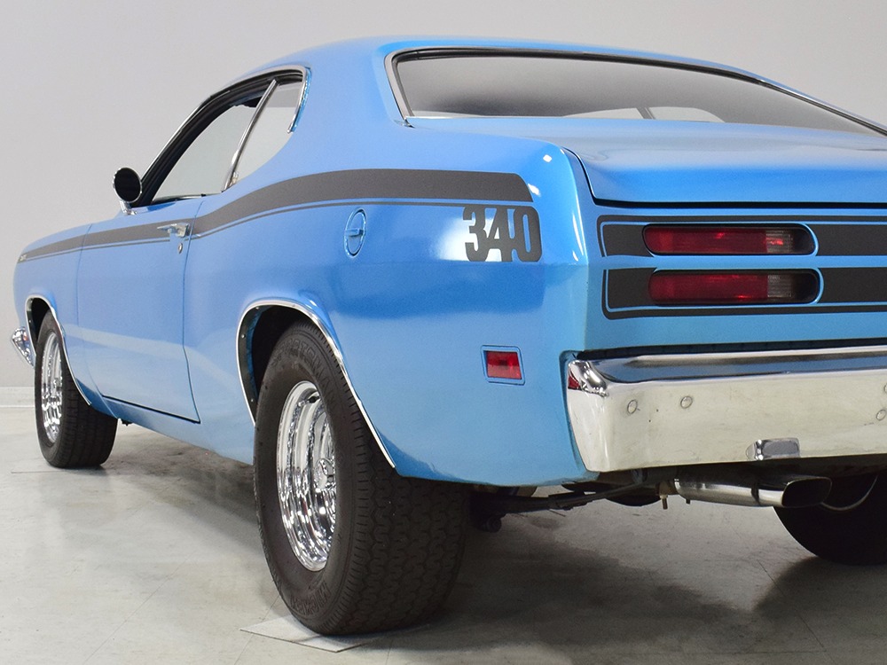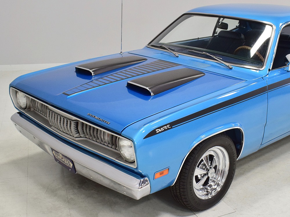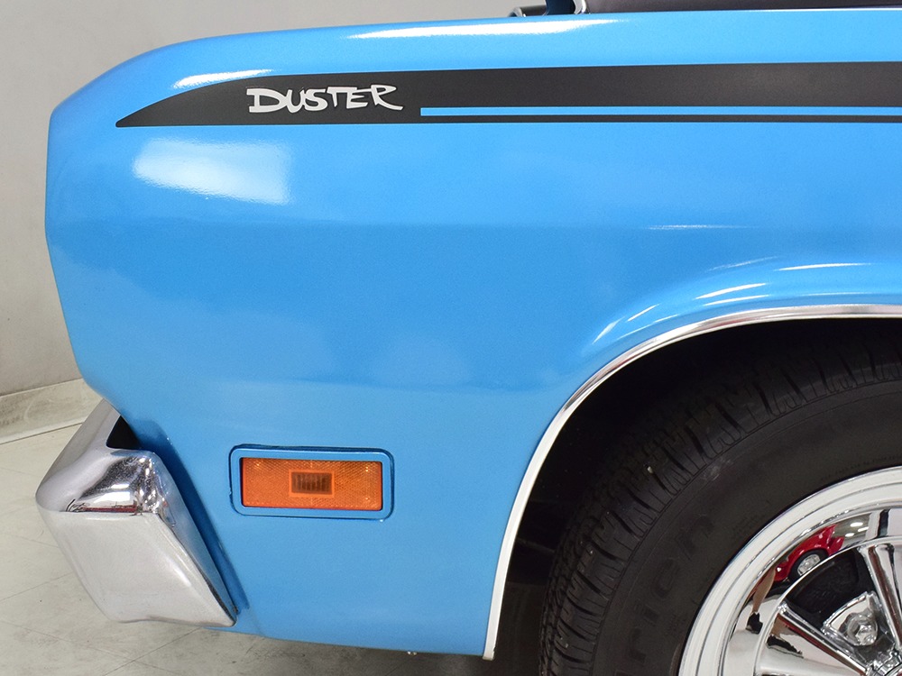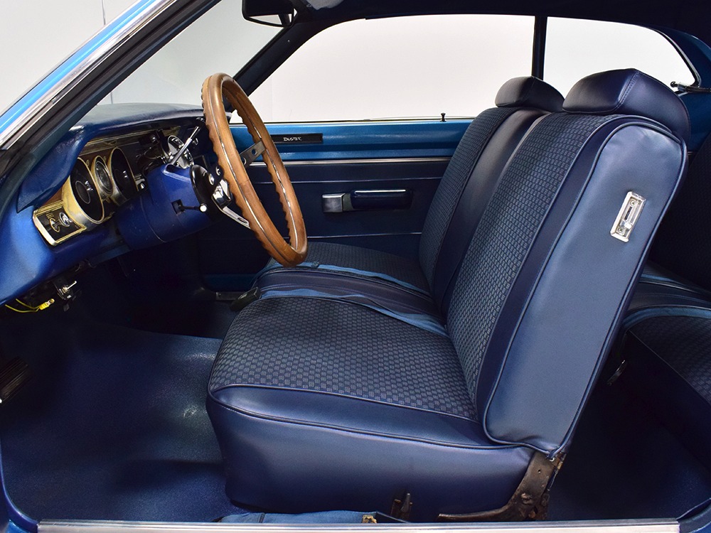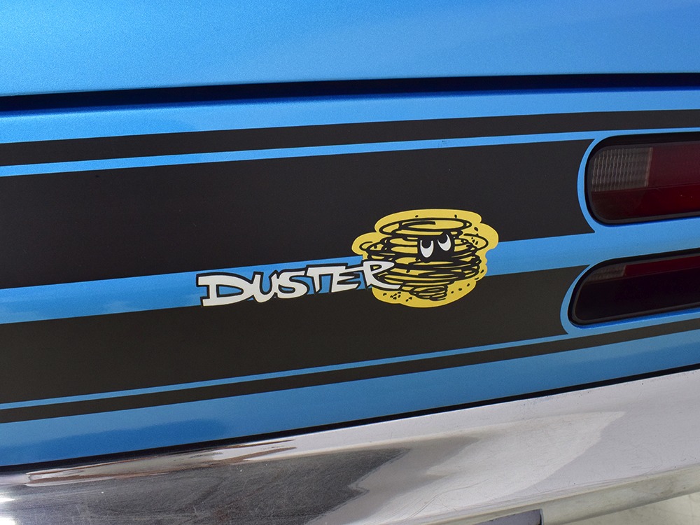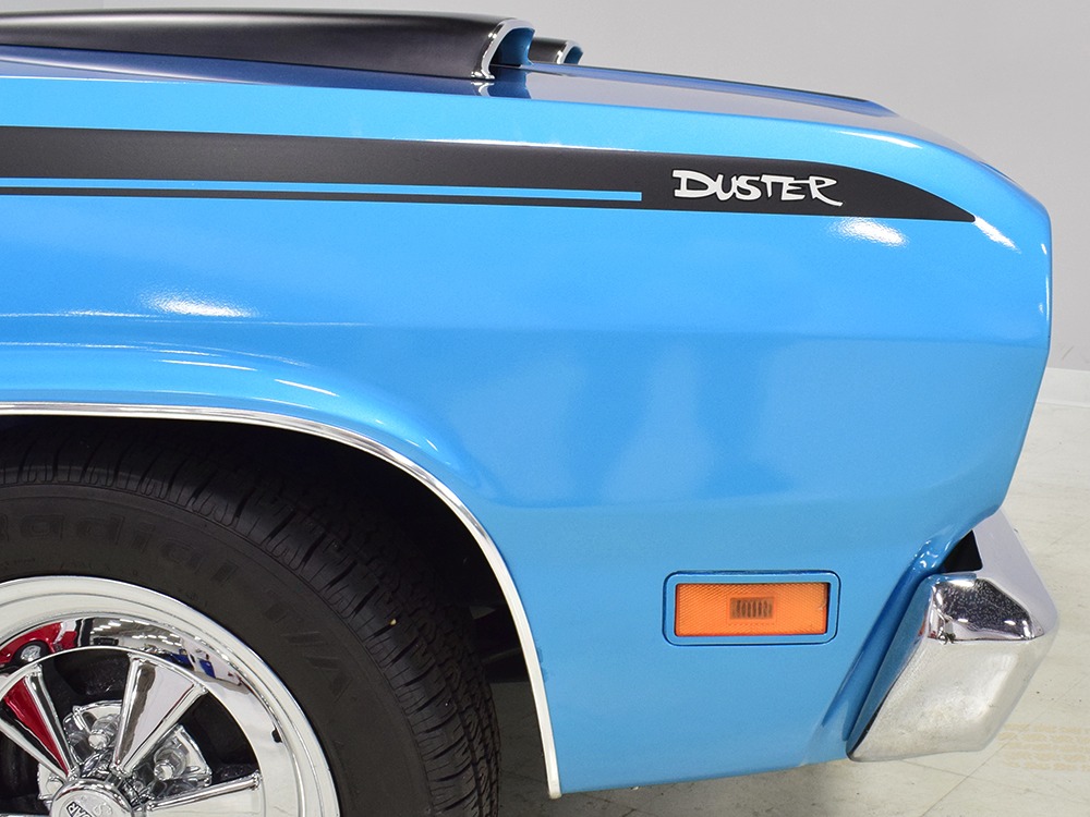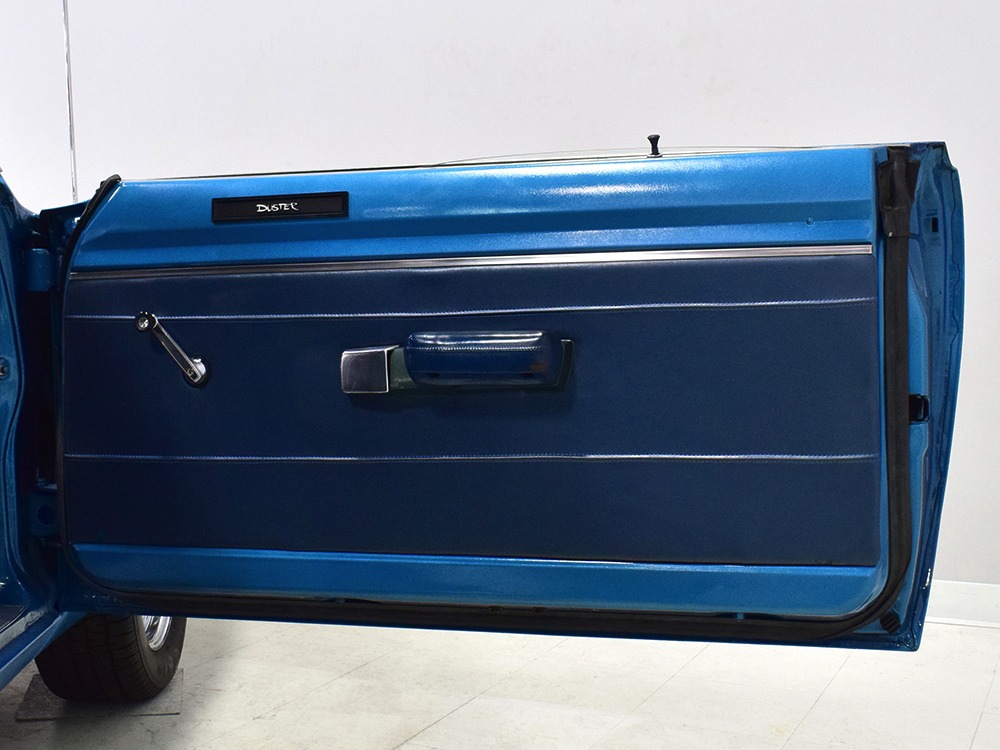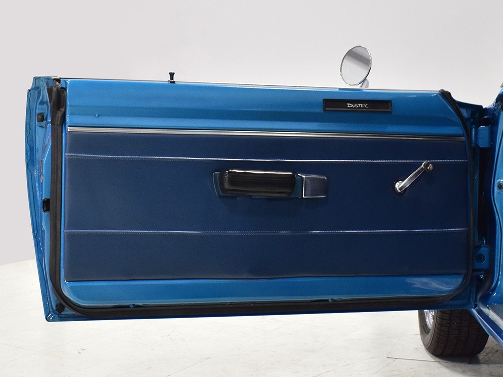 What this Duster really does best is hammer down the road, mostly thanks to the freshly built 340 cubic inch V8 living under the hood. It would be a mistake to dismiss this small block, as more than a few guys in their 440 ‘Cudas were embarrassed by similar cars back in the day. This one is even more potent, having been recently rebuilt with an upgraded cam that gives it a lopey idle, an Edelbrock 600 CFM 4-barrel carburetor on a Weiand intake manifold, and beautiful ceramic-coated long-tube headers that help build torque. It is indeed beautifully detailed with Hemi Orange paint on the block, finned Mopar Performance valve covers, and a chrome air cleaner, but the most remarkable thing is that when you turn the key, it springs to life almost instantly and idles well even when it’s cold. The guys at Customs Unlimited spent a lot of time tuning this one to get it right. You’ll note that the bright blue paint in the engine bay is just as nice as the rest of the body, and almost every single external component is new, not just cleaned up and bolted back on. There’s easily twice the asking price wrapped up in the restoration.