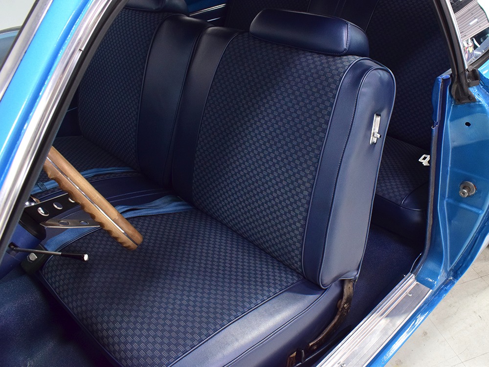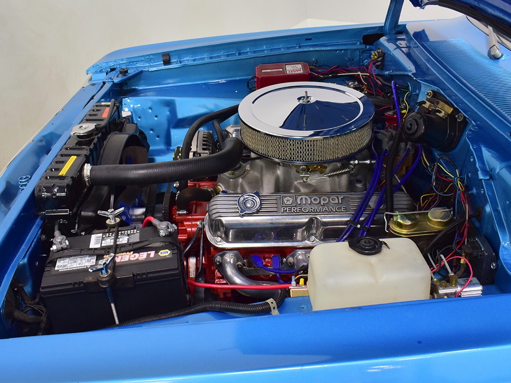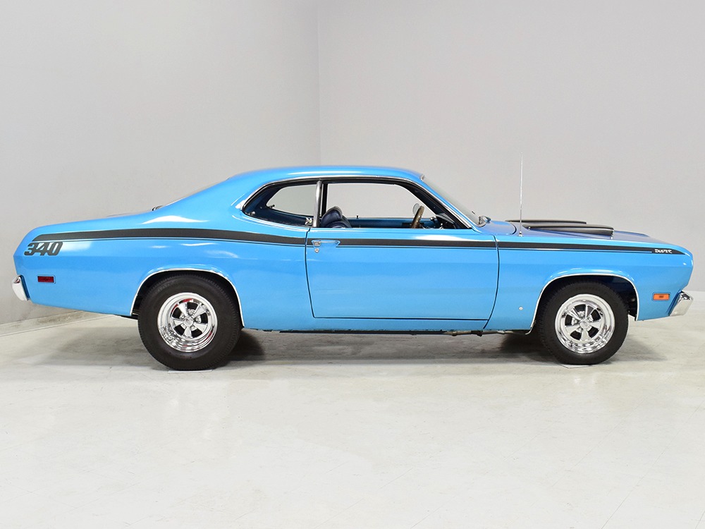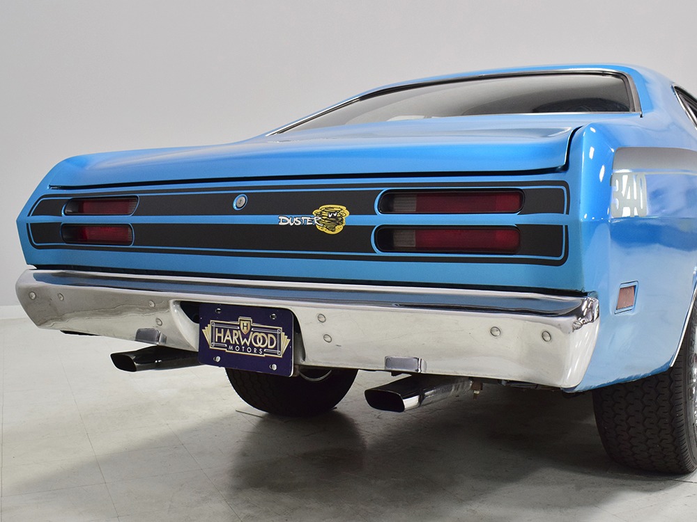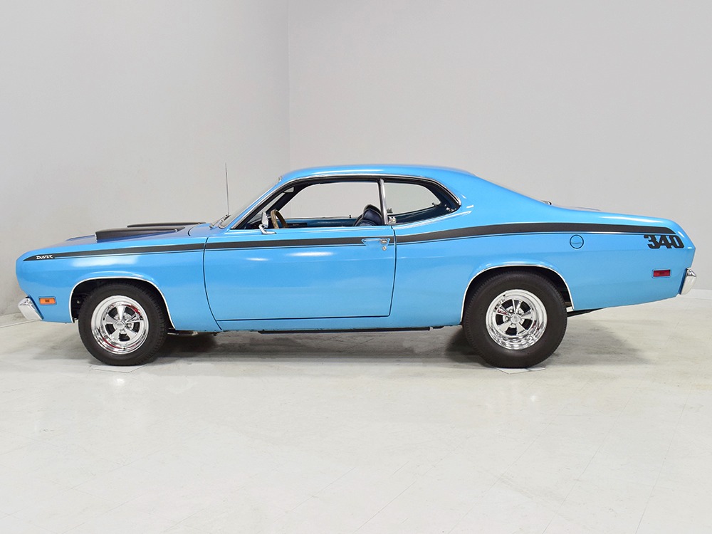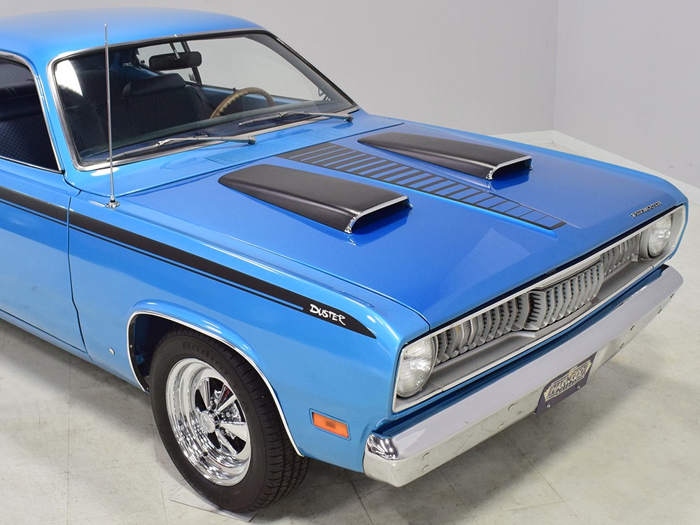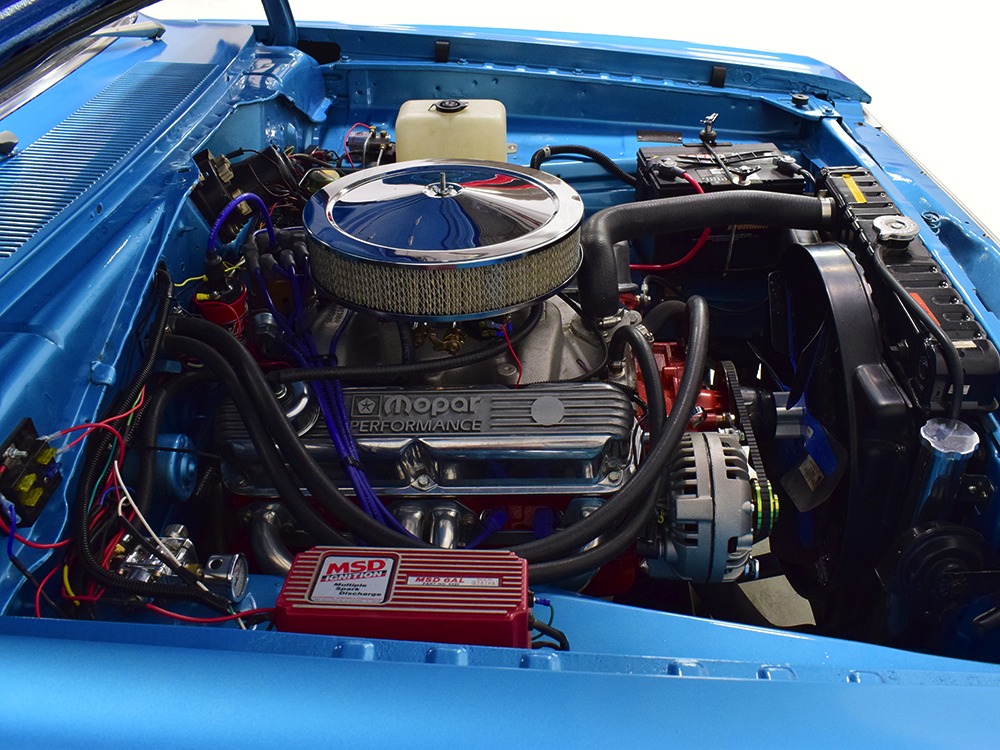 What this Duster really does best is hammer down the road, mostly thanks to the freshly built 340 cubic inch V8 living under the hood. It would be a mistake to dismiss this small block, as more than a few guys in their 440 ‘Cudas were embarrassed by similar cars back in the day. This one is even more potent, having been recently rebuilt with an upgraded cam that gives it a lopey idle, an Edelbrock 600 CFM 4-barrel carburetor on a Weiand intake manifold, and beautiful ceramic-coated long-tube headers that help build torque. It is indeed beautifully detailed with Hemi Orange paint on the block, finned Mopar Performance valve covers, and a chrome air cleaner, but the most remarkable thing is that when you turn the key, it springs to life almost instantly and idles well even when it’s cold. The guys at Customs Unlimited spent a lot of time tuning this one to get it right. You’ll note that the bright blue paint in the engine bay is just as nice as the rest of the body, and almost every single external component is new, not just cleaned up and bolted back on. There’s easily twice the asking price wrapped up in the restoration.