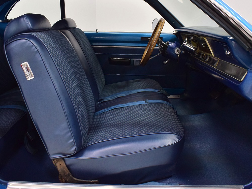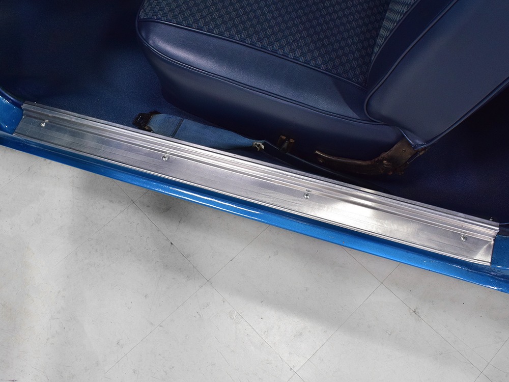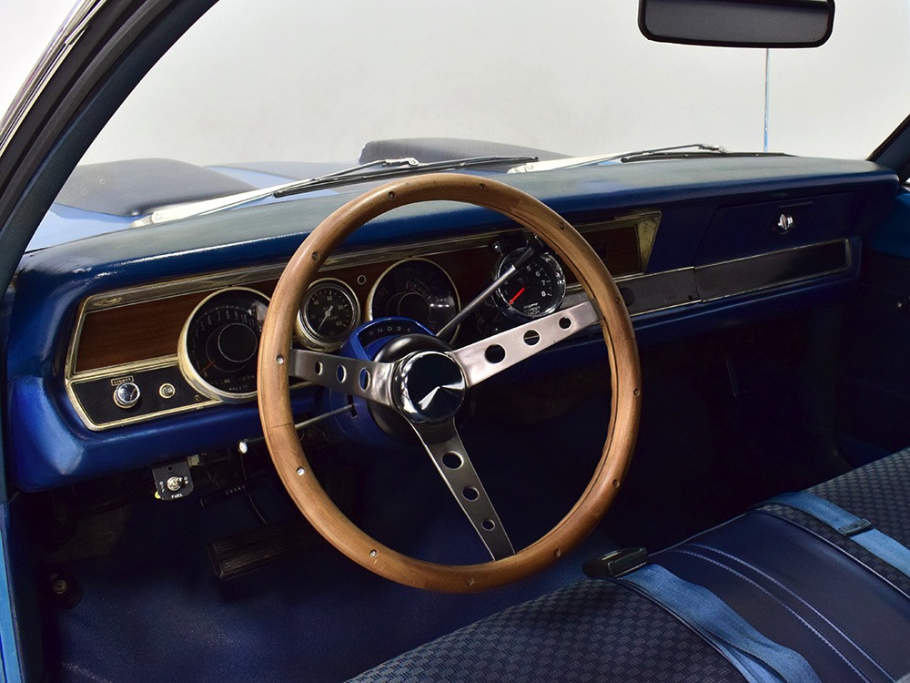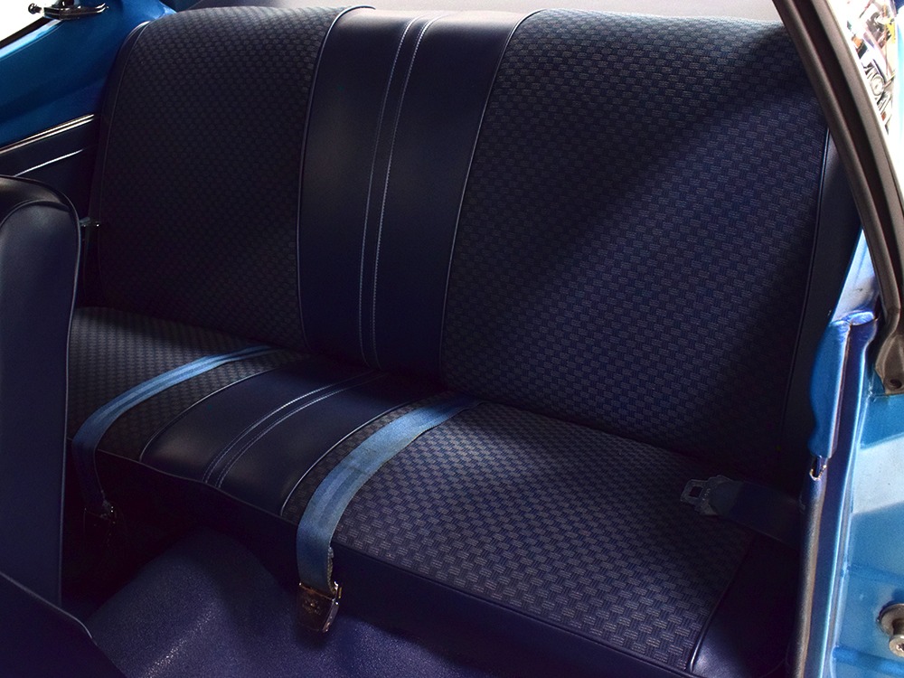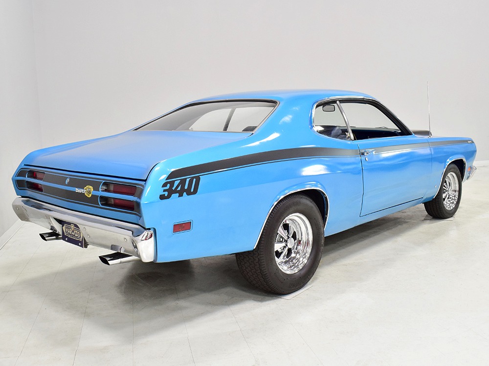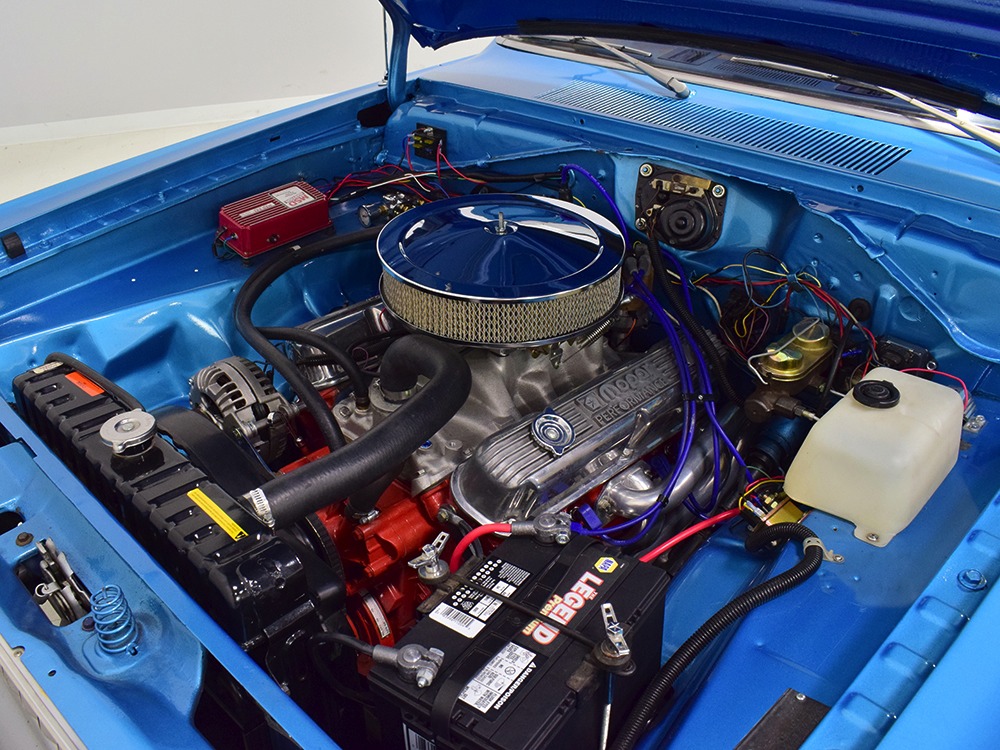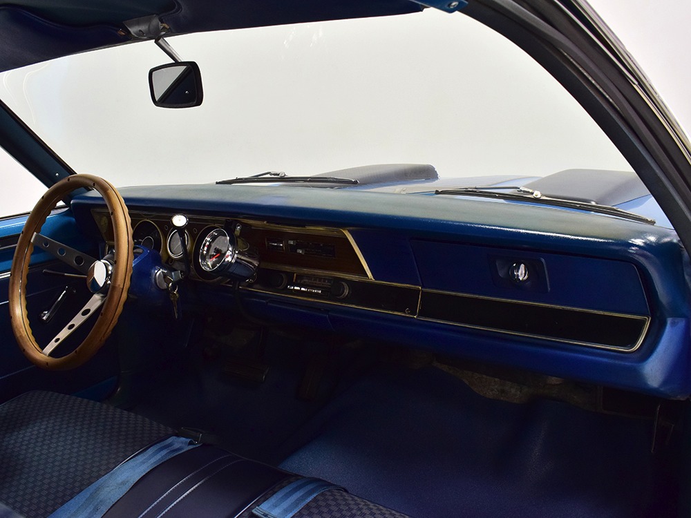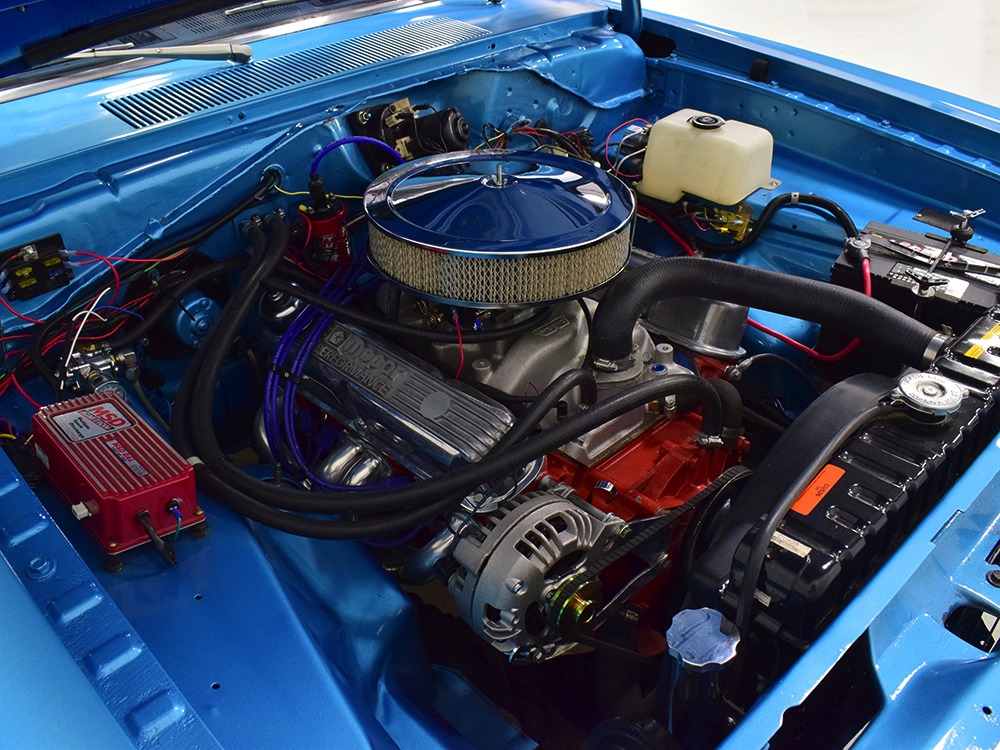 What this Duster really does best is hammer down the road, mostly thanks to the freshly built 340 cubic inch V8 living under the hood. It would be a mistake to dismiss this small block, as more than a few guys in their 440 ‘Cudas were embarrassed by similar cars back in the day. This one is even more potent, having been recently rebuilt with an upgraded cam that gives it a lopey idle, an Edelbrock 600 CFM 4-barrel carburetor on a Weiand intake manifold, and beautiful ceramic-coated long-tube headers that help build torque. It is indeed beautifully detailed with Hemi Orange paint on the block, finned Mopar Performance valve covers, and a chrome air cleaner, but the most remarkable thing is that when you turn the key, it springs to life almost instantly and idles well even when it’s cold. The guys at Customs Unlimited spent a lot of time tuning this one to get it right. You’ll note that the bright blue paint in the engine bay is just as nice as the rest of the body, and almost every single external component is new, not just cleaned up and bolted back on. There’s easily twice the asking price wrapped up in the restoration.