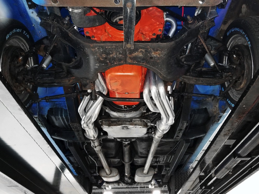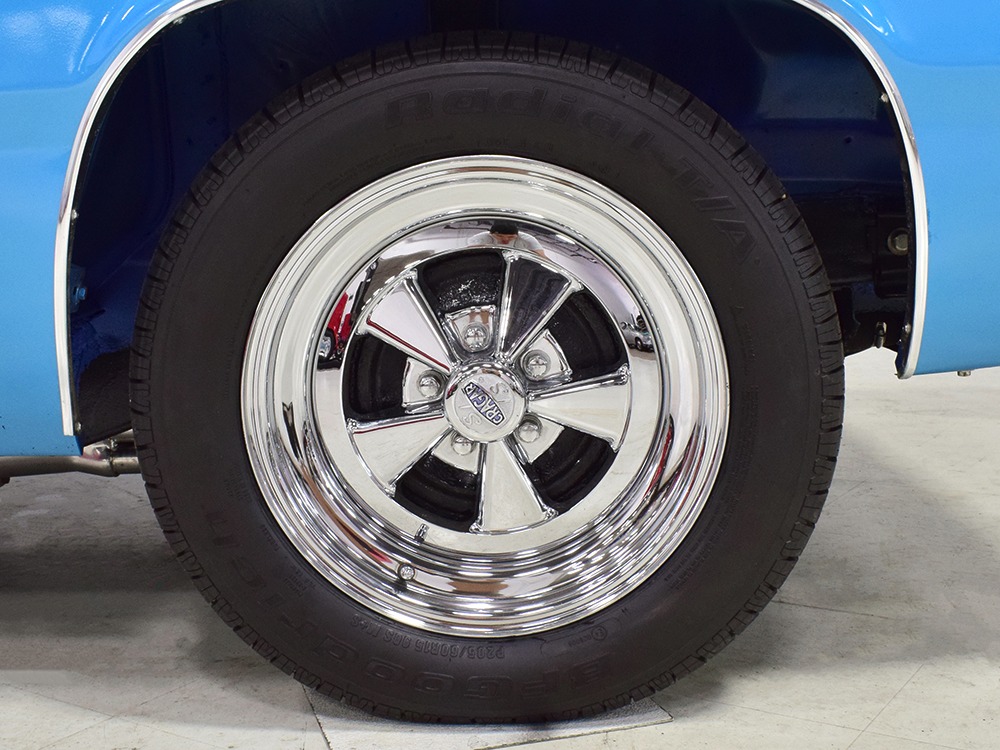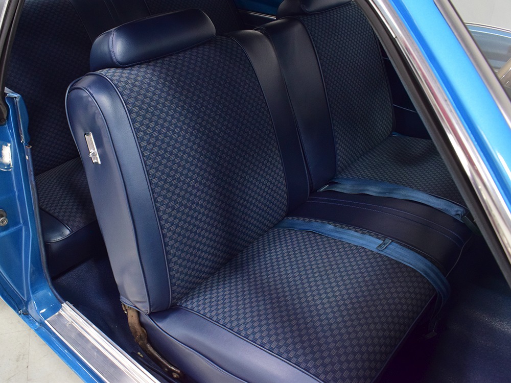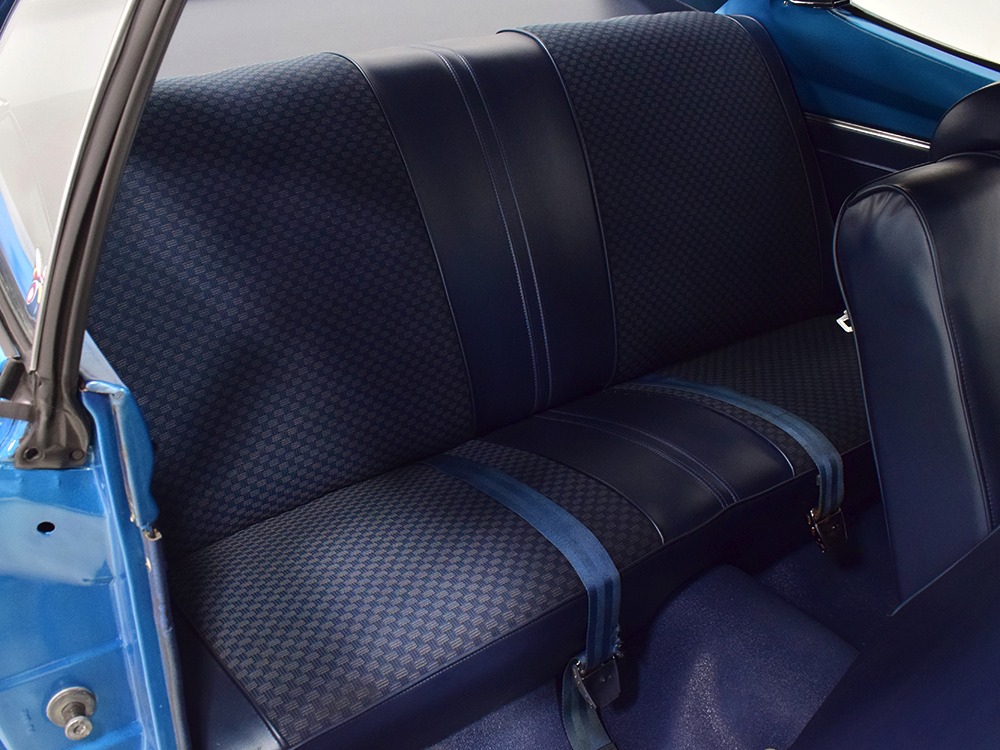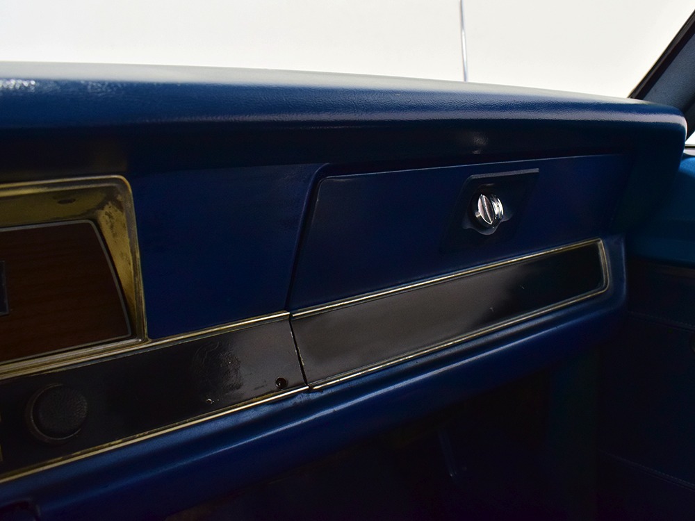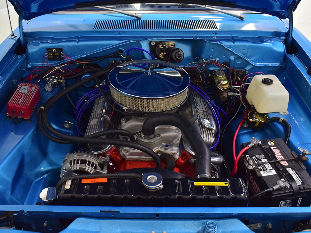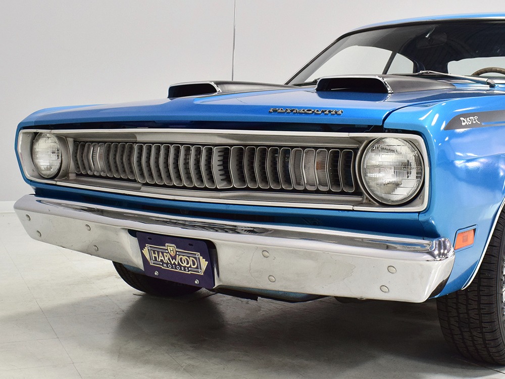 What this Duster really does best is hammer down the road, mostly thanks to the freshly built 340 cubic inch V8 living under the hood. It would be a mistake to dismiss this small block, as more than a few guys in their 440 ‘Cudas were embarrassed by similar cars back in the day. This one is even more potent, having been recently rebuilt with an upgraded cam that gives it a lopey idle, an Edelbrock 600 CFM 4-barrel carburetor on a Weiand intake manifold, and beautiful ceramic-coated long-tube headers that help build torque. It is indeed beautifully detailed with Hemi Orange paint on the block, finned Mopar Performance valve covers, and a chrome air cleaner, but the most remarkable thing is that when you turn the key, it springs to life almost instantly and idles well even when it’s cold. The guys at Customs Unlimited spent a lot of time tuning this one to get it right. You’ll note that the bright blue paint in the engine bay is just as nice as the rest of the body, and almost every single external component is new, not just cleaned up and bolted back on. There’s easily twice the asking price wrapped up in the restoration.