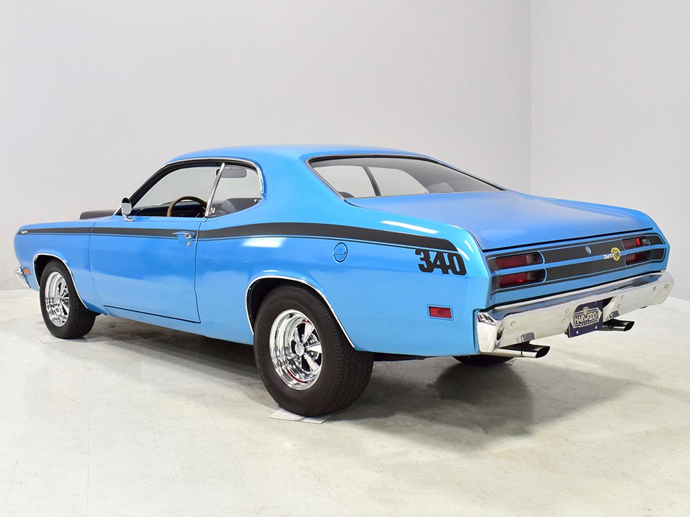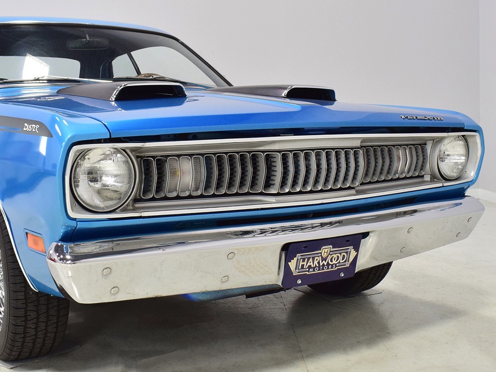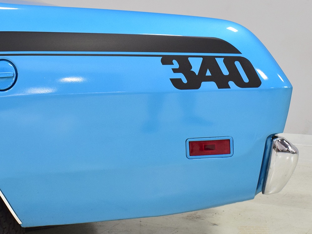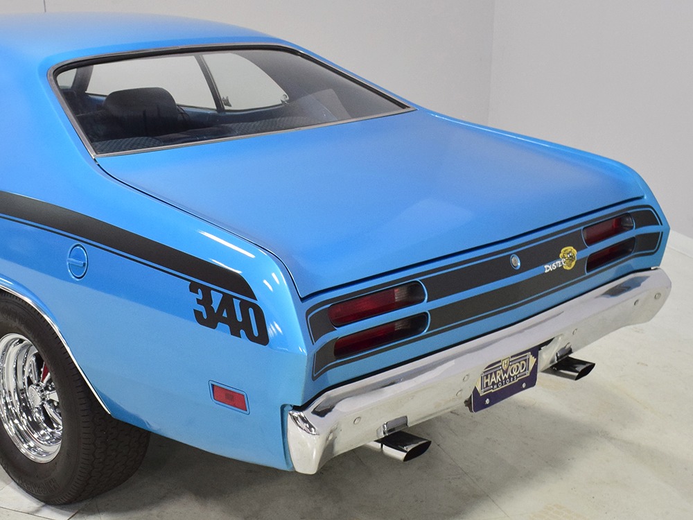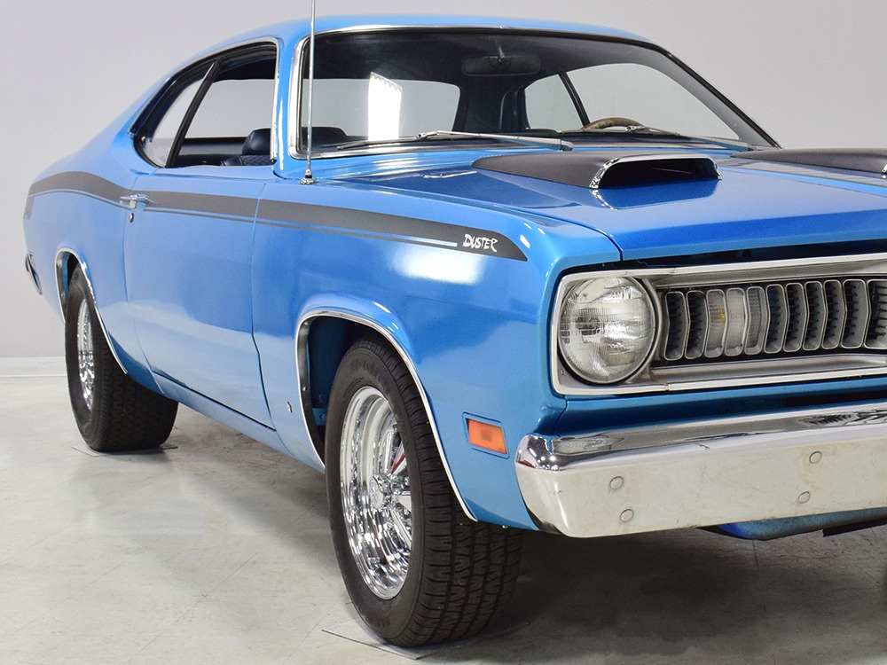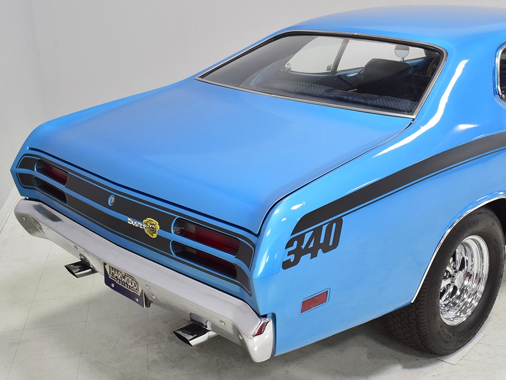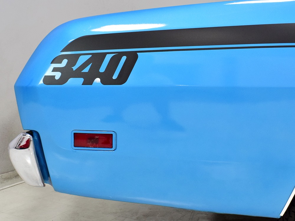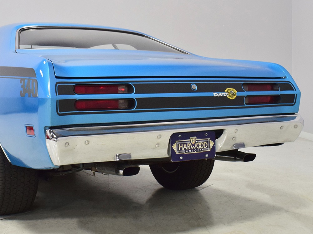 We don’t have a lot of history after Harold took it home, but the sheetmetal appears to be all original so there are no patches and no crappy reproduction body panels. It was repainted several years ago in the original B5 Blue, a popular Mopar color that works rather well on the intense little Duster. It isn’t show-quality, but it’s about right for a car that is so reasonably priced, then and now. You could probably give it a wet sand and buff to really bring out a shine, but even as it sits, the chunky little Duster looks great. Correct Duster 340 graphics were installed on the flanks and hood, as well as a set of Chrysler’s popular twin hood scoops which make this compact look more than a little nasty. All the chrome and stainless trim appears to be in good original condition and even details like the grille and taillights reflect the car’s easy previous life. This is a car that’s ready, willing, and able to have fun.