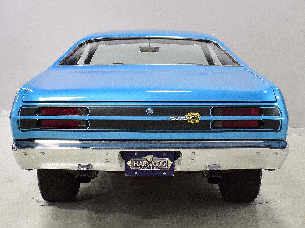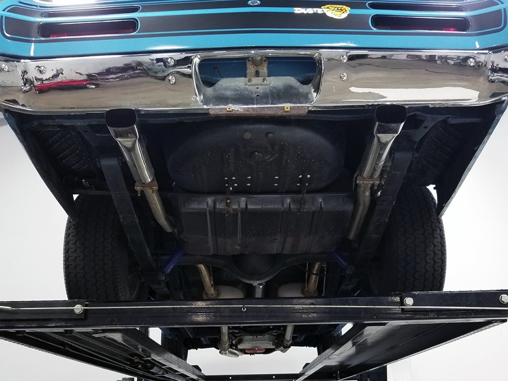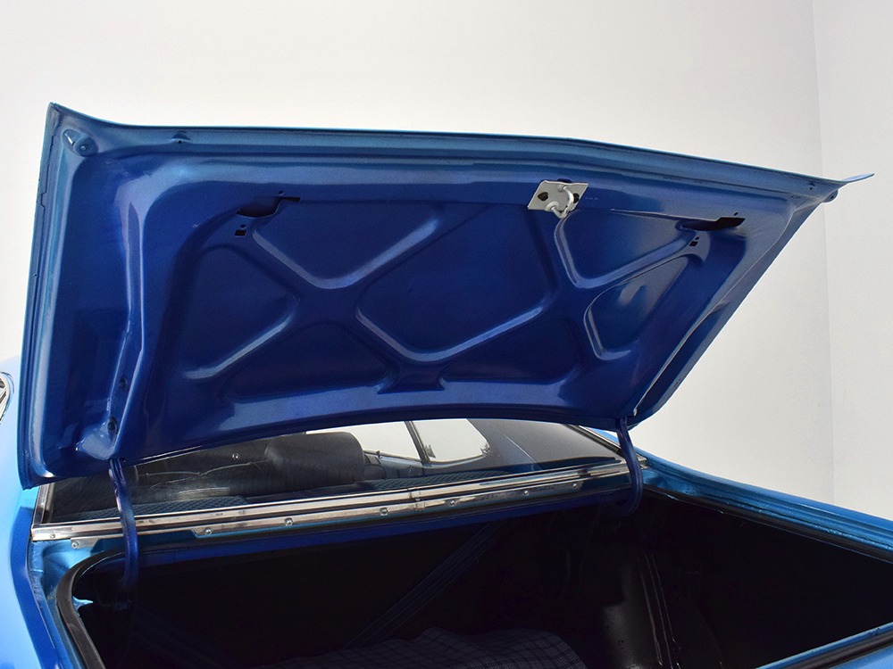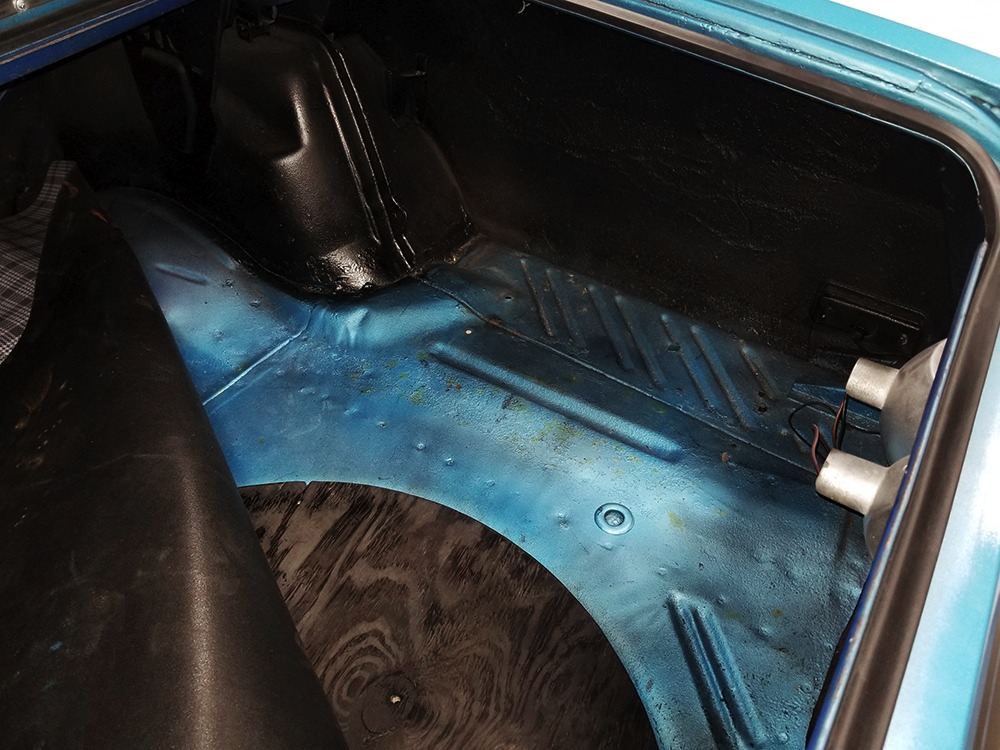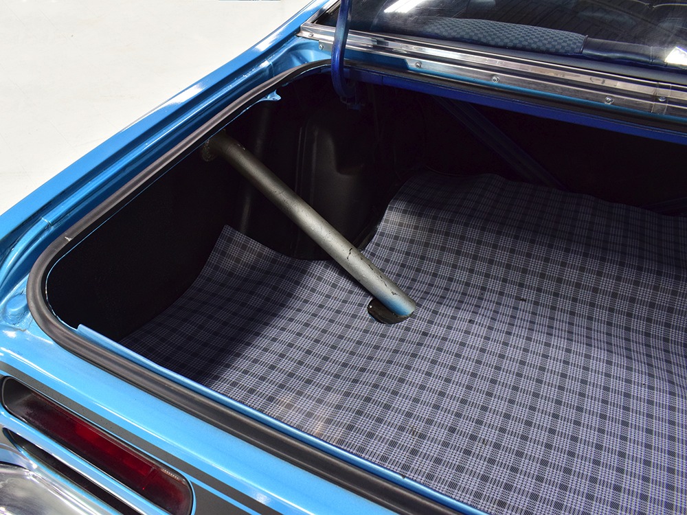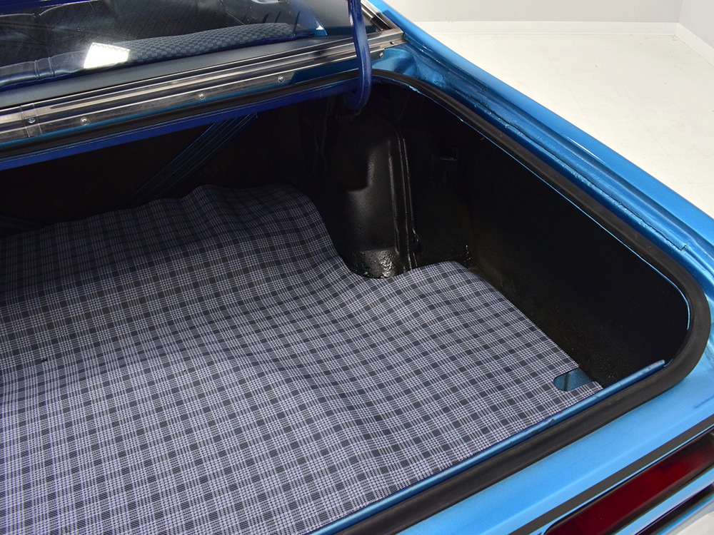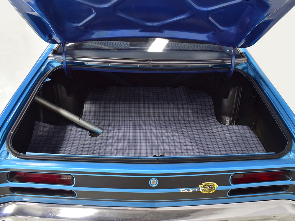 The blue cloth and vinyl interior is nicely restored using correct materials and patterns. It’s not dated, and the checkered cloth is a nice step up from the usual vinyl. The front bench looks purposeful and has no popped seams or notable wear, and there’s still a comfortable spring to it when you slide behind the wheel. Sure, it’s a bench seat car with a column shifter, but remember that these cars were not about upgrades and expensive options, they were performance on a budget and this car delivers in spades. Rubber floor mats are a reminder of the car’s working-class roots, but I don’t think anyone will complain about the accommodations once the engine cackles to life. The original wheel has been replaced by a handsome wood-rimmed unit, and things like the woodgrained applique on the instrument panel and factory gauges are in good shape with only slight fading. And while this Duster carries a full array of factory instruments, someone has thoughtfully added an oil pressure gauge in the center of the dash and a big Auto Meter tach to better monitor the engine’s vitals. The transmission is a 727 TorqueFlite 3-speed automatic with a manual valve body, so you do have to shift it yourself, but you’ll find that it’s actually a lot of fun to click the shifter through the gears and feel the transmission shift instantly—you can probably bark the tires on the 2-3 shift if you’re running hard. The original AM radio is still in the center of the dash, but it’s probably due for an upgrade (or not, because I bet you’ll never want to use the radio in this car). The only real issue is a headliner that’s wrinkly, but a professional upholsterer could probably take care of that in an hour or two. The trunk is obviously original and you can see that there’s exactly zero rust in this car and that it still sports its original quarters, floors, and trunk extensions, and there’s a reproduction mat on top to make it look right.