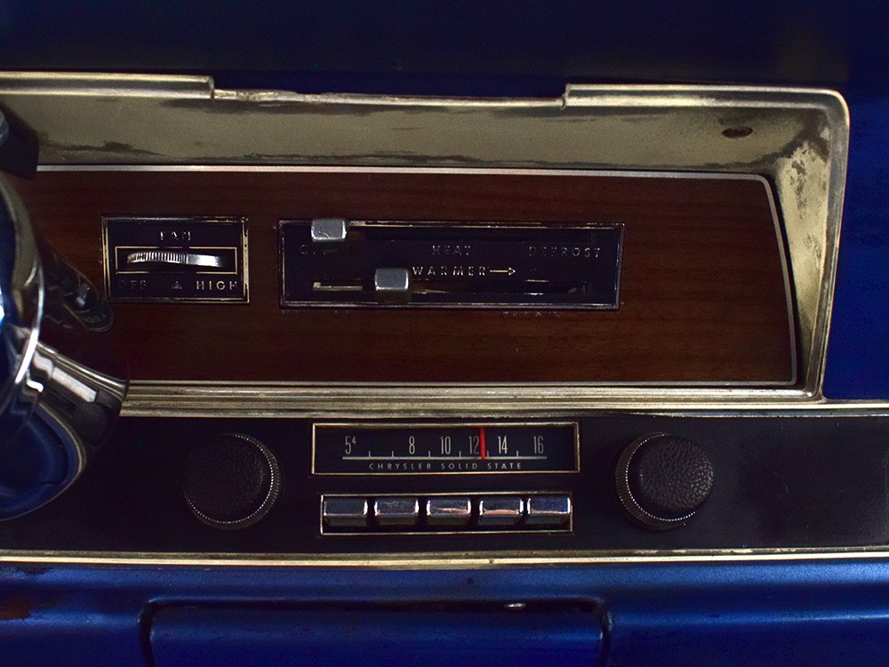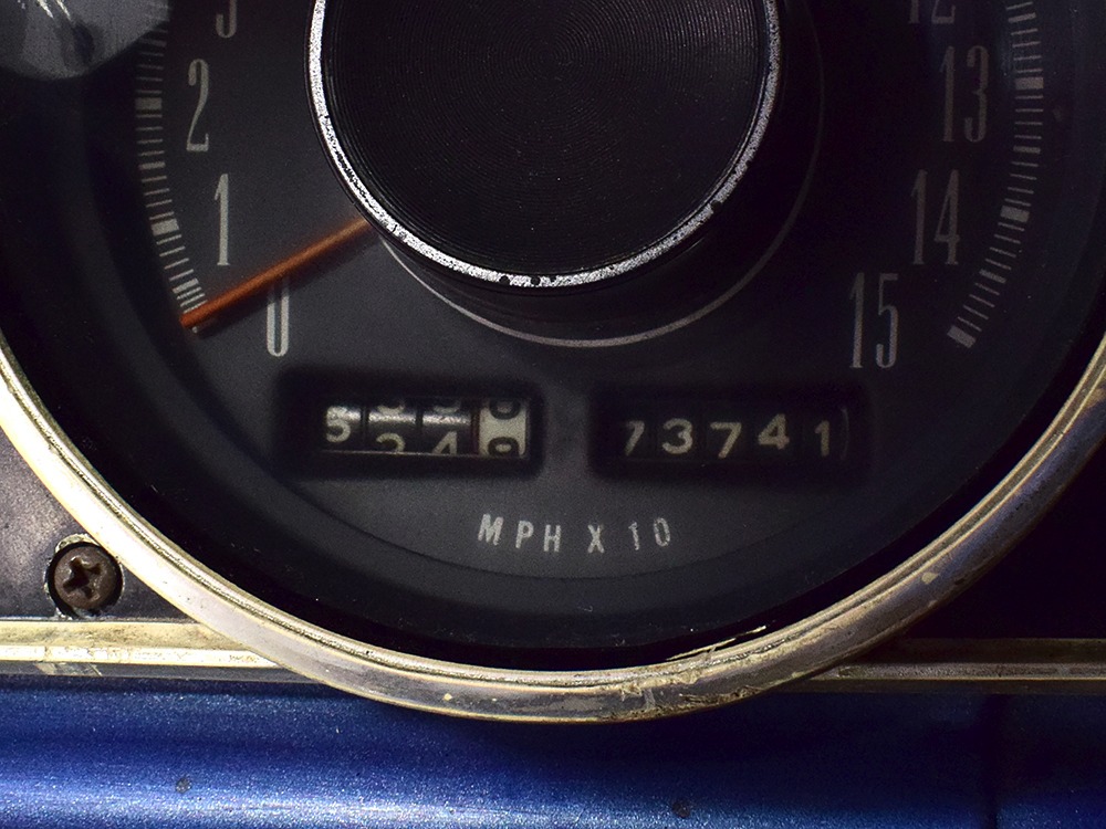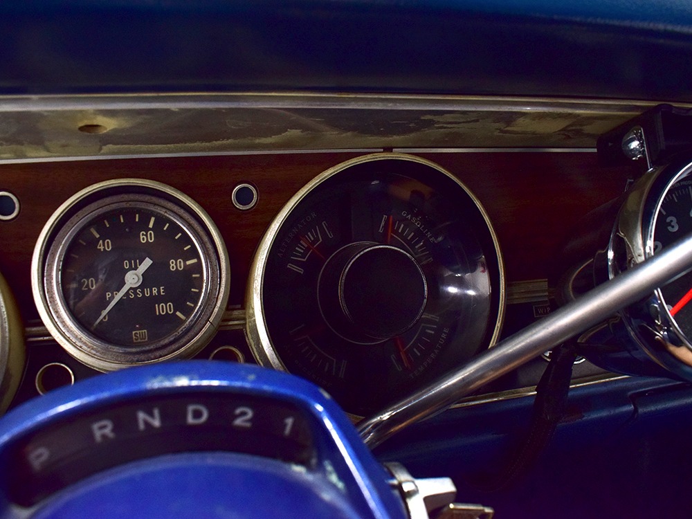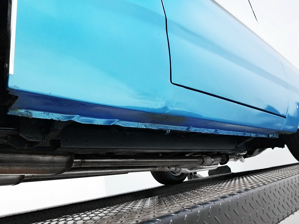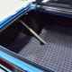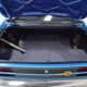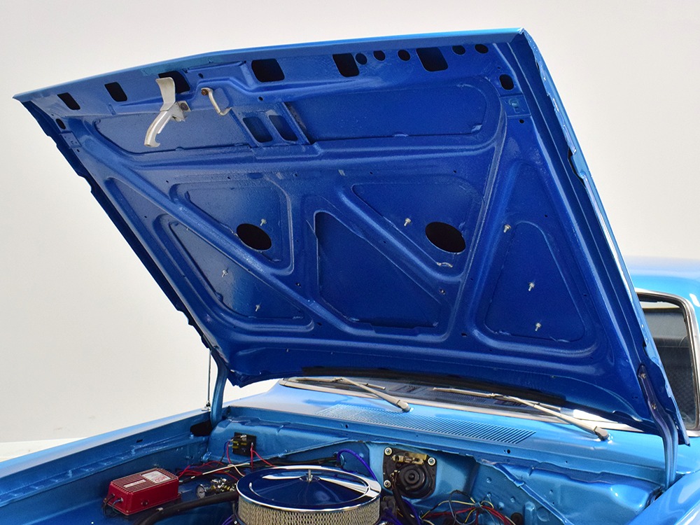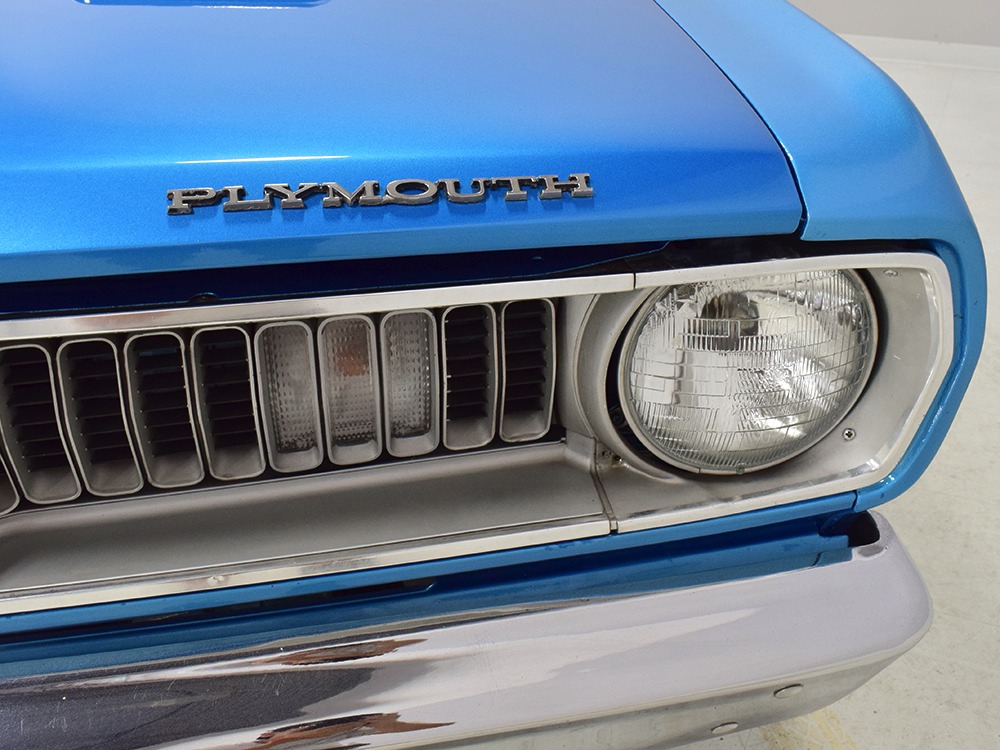 The blue cloth and vinyl interior is nicely restored using correct materials and patterns. It’s not dated, and the checkered cloth is a nice step up from the usual vinyl. The front bench looks purposeful and has no popped seams or notable wear, and there’s still a comfortable spring to it when you slide behind the wheel. Sure, it’s a bench seat car with a column shifter, but remember that these cars were not about upgrades and expensive options, they were performance on a budget and this car delivers in spades. Rubber floor mats are a reminder of the car’s working-class roots, but I don’t think anyone will complain about the accommodations once the engine cackles to life. The original wheel has been replaced by a handsome wood-rimmed unit, and things like the woodgrained applique on the instrument panel and factory gauges are in good shape with only slight fading. And while this Duster carries a full array of factory instruments, someone has thoughtfully added an oil pressure gauge in the center of the dash and a big Auto Meter tach to better monitor the engine’s vitals. The transmission is a 727 TorqueFlite 3-speed automatic with a manual valve body, so you do have to shift it yourself, but you’ll find that it’s actually a lot of fun to click the shifter through the gears and feel the transmission shift instantly—you can probably bark the tires on the 2-3 shift if you’re running hard. The original AM radio is still in the center of the dash, but it’s probably due for an upgrade (or not, because I bet you’ll never want to use the radio in this car). The only real issue is a headliner that’s wrinkly, but a professional upholsterer could probably take care of that in an hour or two. The trunk is obviously original and you can see that there’s exactly zero rust in this car and that it still sports its original quarters, floors, and trunk extensions, and there’s a reproduction mat on top to make it look right.