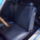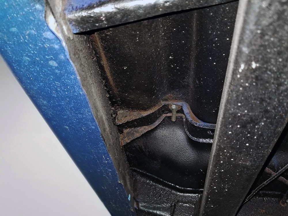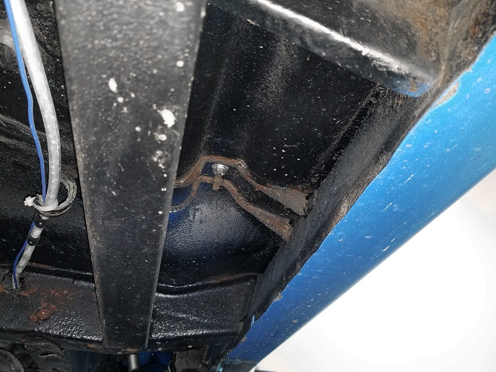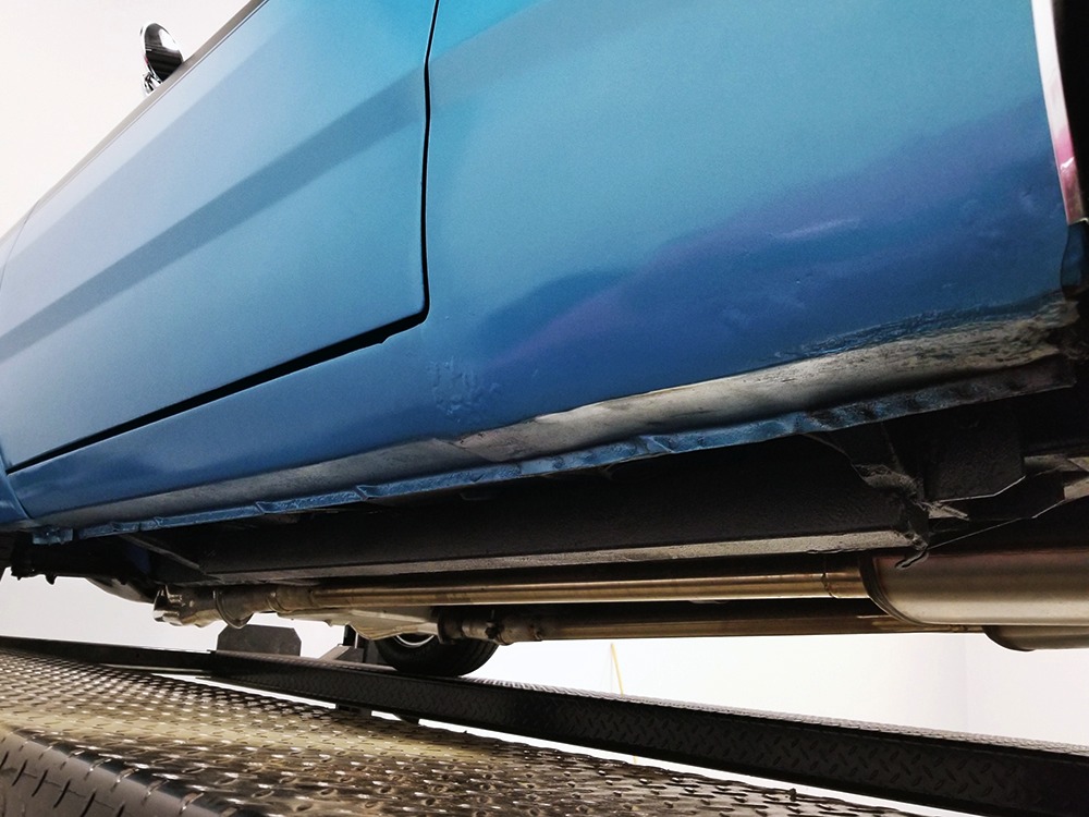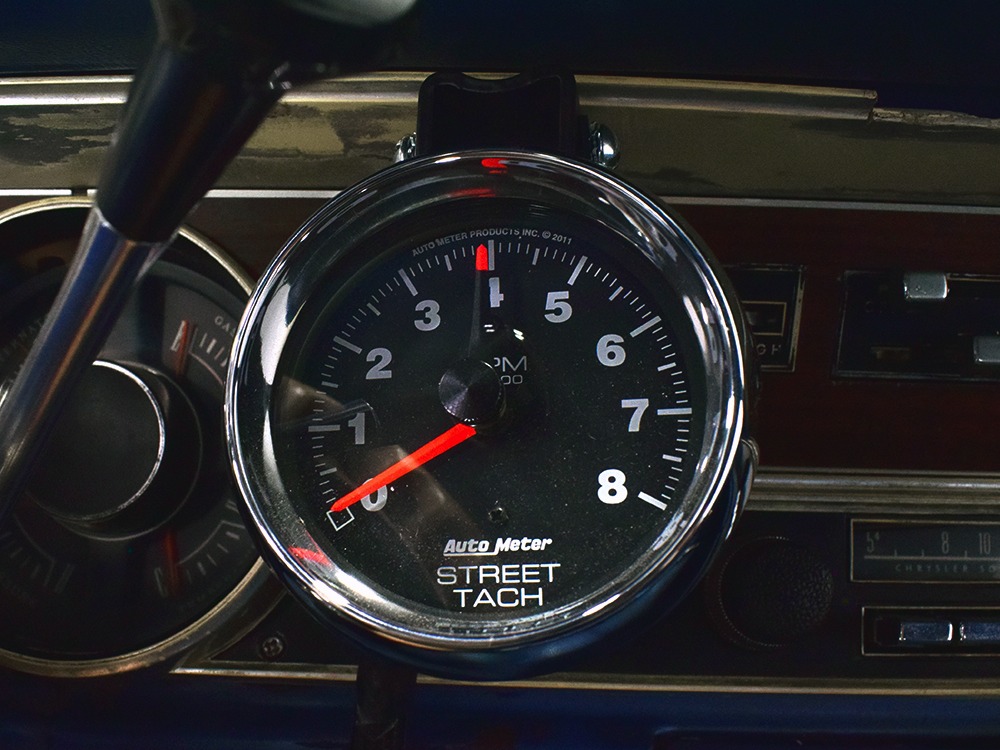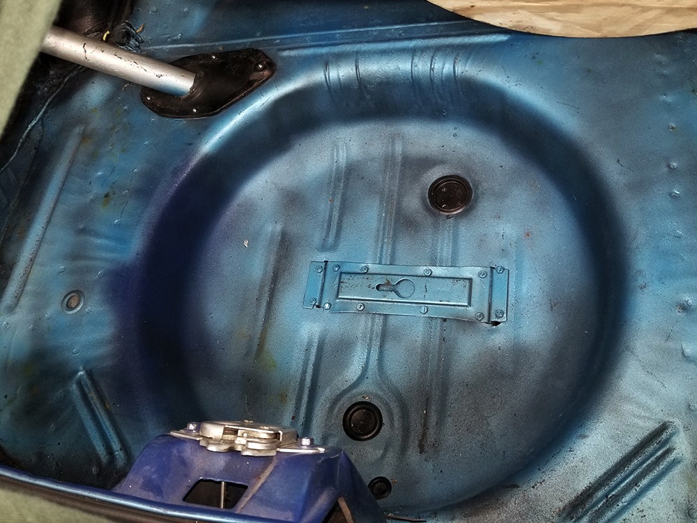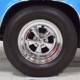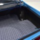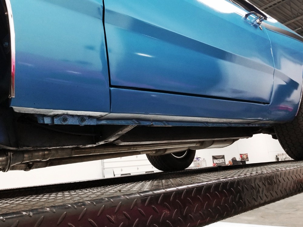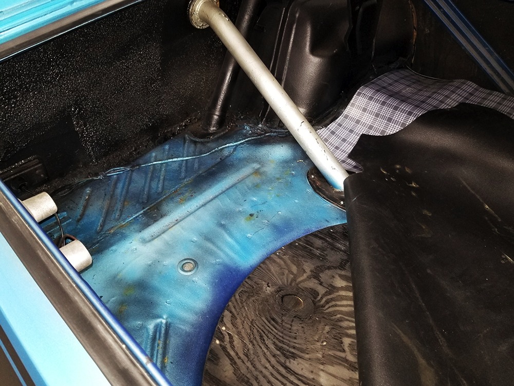 The blue cloth and vinyl interior is nicely restored using correct materials and patterns. It’s not dated, and the checkered cloth is a nice step up from the usual vinyl. The front bench looks purposeful and has no popped seams or notable wear, and there’s still a comfortable spring to it when you slide behind the wheel. Sure, it’s a bench seat car with a column shifter, but remember that these cars were not about upgrades and expensive options, they were performance on a budget and this car delivers in spades. Rubber floor mats are a reminder of the car’s working-class roots, but I don’t think anyone will complain about the accommodations once the engine cackles to life. The original wheel has been replaced by a handsome wood-rimmed unit, and things like the woodgrained applique on the instrument panel and factory gauges are in good shape with only slight fading. And while this Duster carries a full array of factory instruments, someone has thoughtfully added an oil pressure gauge in the center of the dash and a big Auto Meter tach to better monitor the engine’s vitals. The transmission is a 727 TorqueFlite 3-speed automatic with a manual valve body, so you do have to shift it yourself, but you’ll find that it’s actually a lot of fun to click the shifter through the gears and feel the transmission shift instantly—you can probably bark the tires on the 2-3 shift if you’re running hard. The original AM radio is still in the center of the dash, but it’s probably due for an upgrade (or not, because I bet you’ll never want to use the radio in this car). The only real issue is a headliner that’s wrinkly, but a professional upholsterer could probably take care of that in an hour or two. The trunk is obviously original and you can see that there’s exactly zero rust in this car and that it still sports its original quarters, floors, and trunk extensions, and there’s a reproduction mat on top to make it look right.