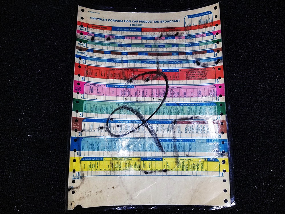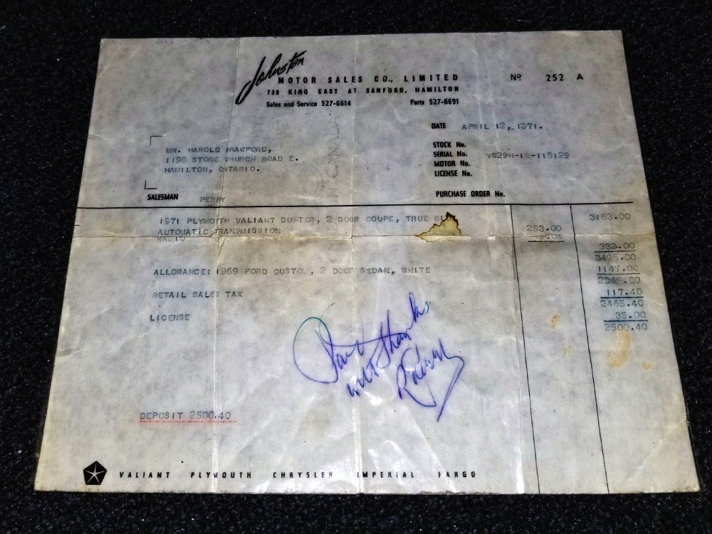 You’ll note that the car was originally delivered to Canada, and we have the original bill of sale from Johnston Motor Sales Co. in Sanford, Hamilton Ontario. It shows a purchase price of $3495 including the automatic transmission and AM radio, plus a trade-in of a 1969 Ford 2-door sedan worth $1147. Out-the-door, Mr. Harold Crawford drove his new 1971 Duster 340 home for just $2500.40, making it one heck of a performance bargain in anyone’s book.