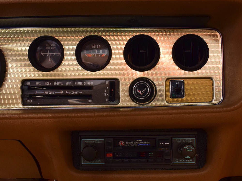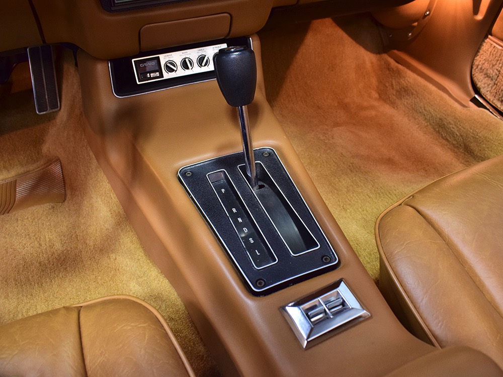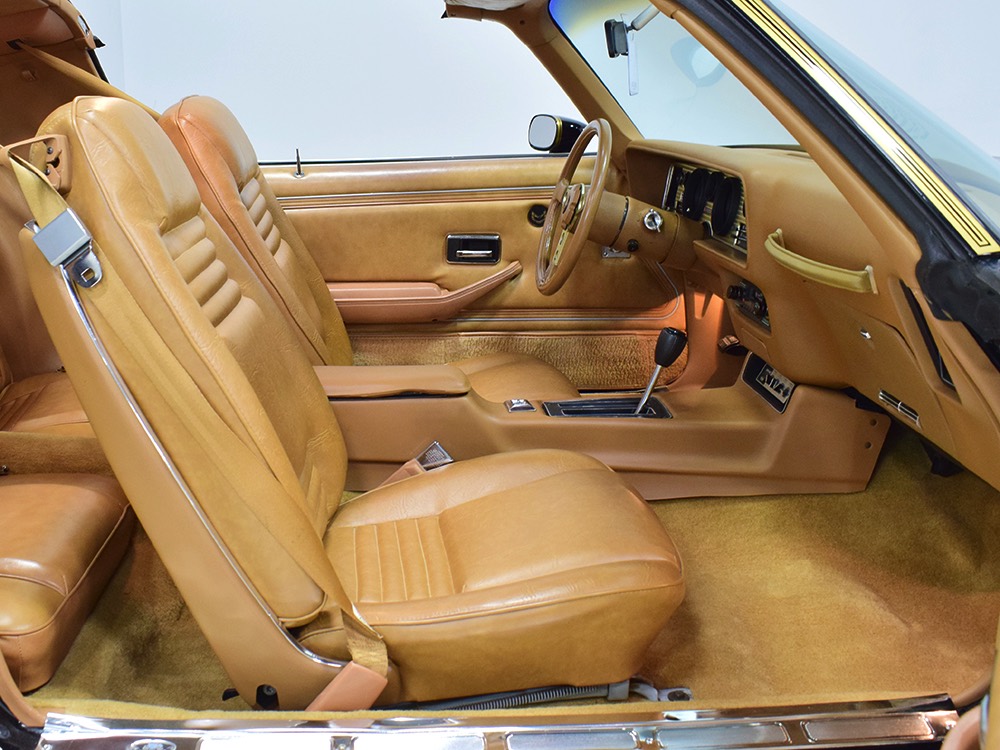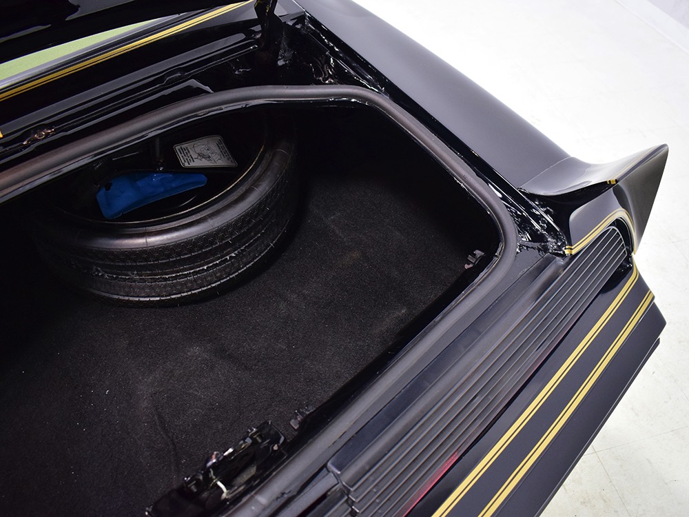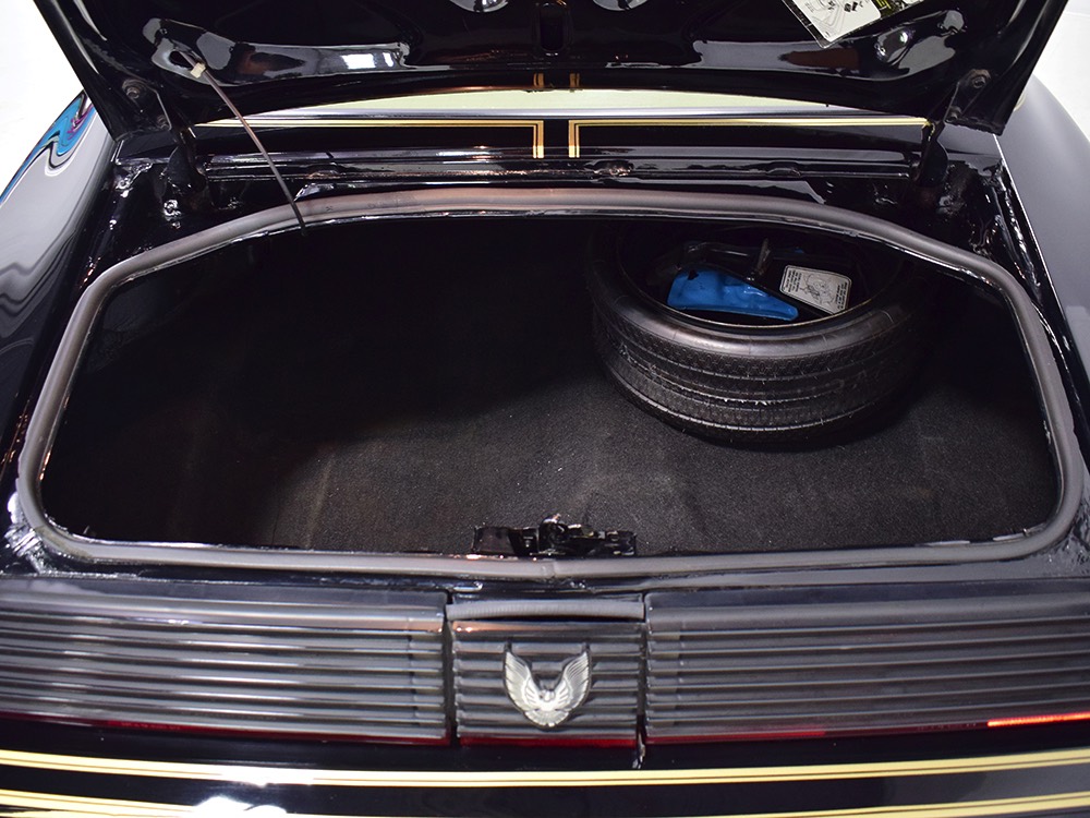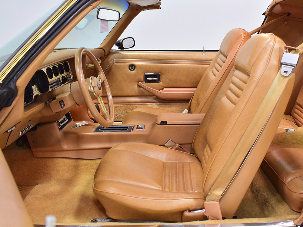 The tan vinyl interior is likewise extremely well preserved with a few restored pieces to really make it look its best. Fresh carpets keep it bright and there’s new foam under the seat covers to make the seats all-day comfortable. Of course, as a top-of-the-line Firebird, this one came with just about every available option, including cold A/C, power windows, a tilt steering wheel, and a rear defroster. Standard equipment included the awesome engine-turned dash and a full complement of gauges, all of which are fully operational. The steering wheel, dash pad, and console are in exemplary condition with no signs of UV damage or cracking that GM plastics often show after four decades. The only non-stock parts are the Pioneer AM/FM/cassette stereo head unit and a Craig mix unit in the console. Headliners are always problematic on GM cars, particularly those with T-tops, but this one is still taut and the weather seals in the T-tops are in good condition so they seal up nicely. The trunk is correctly finished with the original mat and what appears to be the original space-saver spare that has never been used.