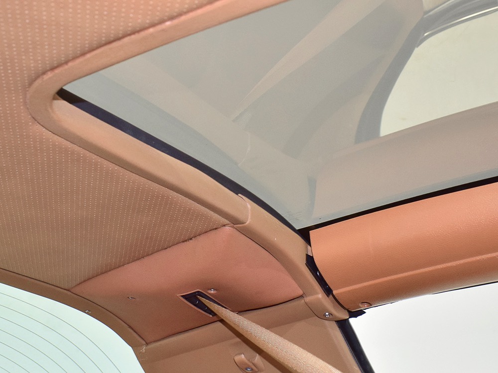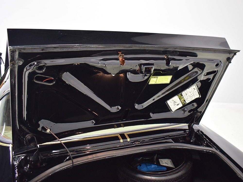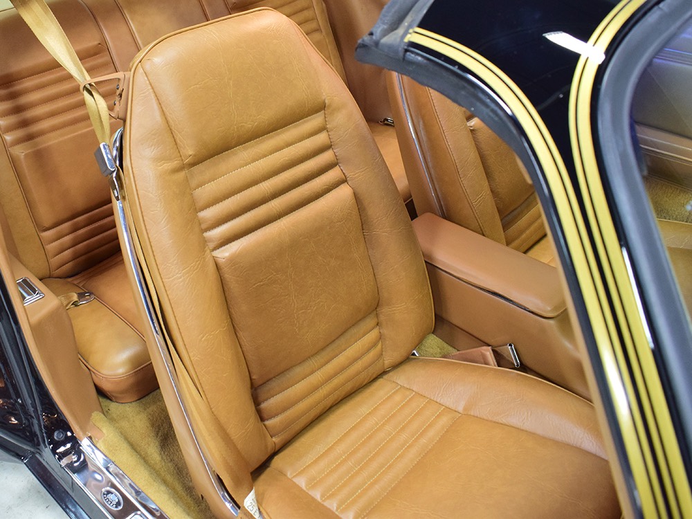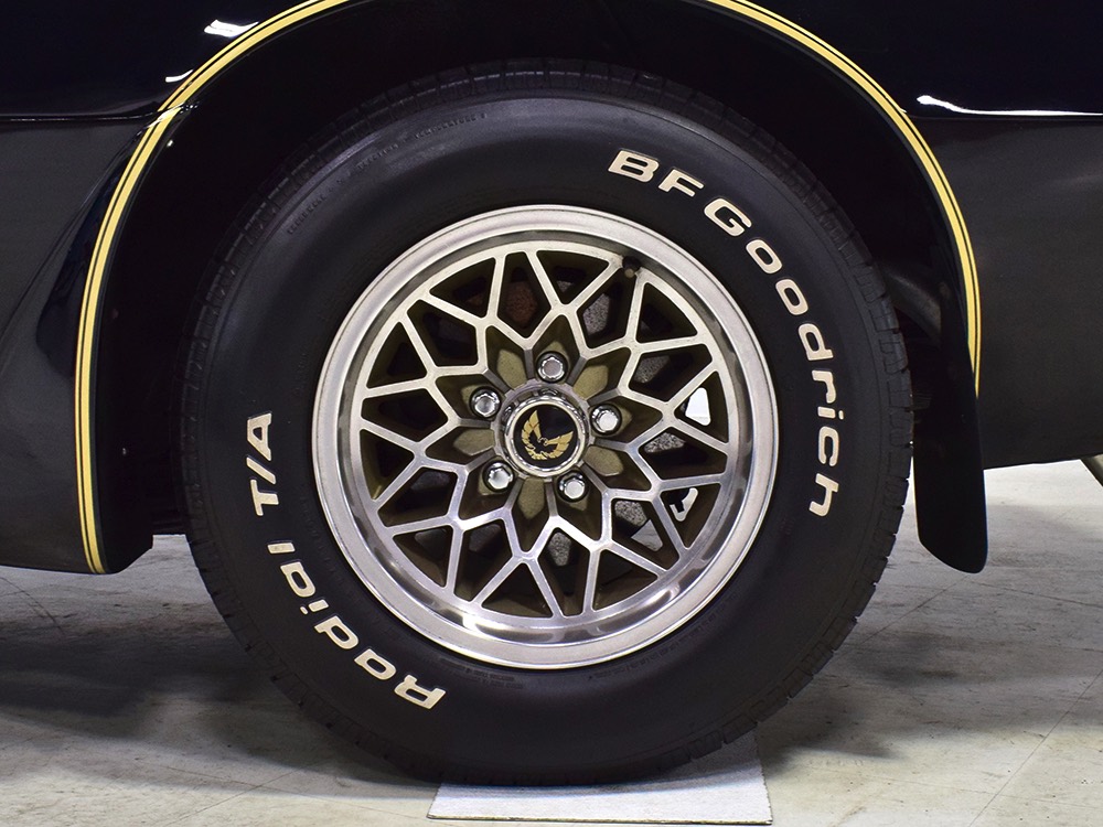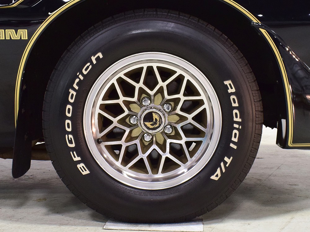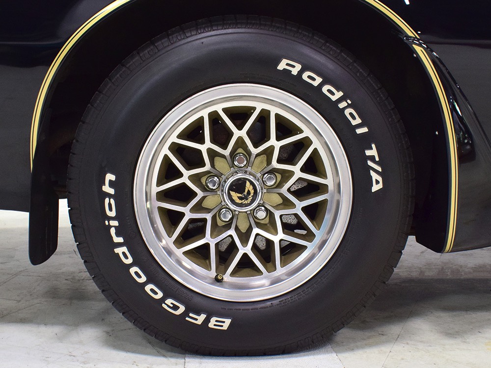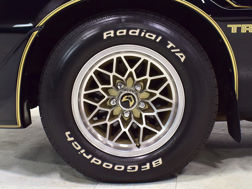 The tan vinyl interior is likewise extremely well preserved with a few restored pieces to really make it look its best. Fresh carpets keep it bright and there’s new foam under the seat covers to make the seats all-day comfortable. Of course, as a top-of-the-line Firebird, this one came with just about every available option, including cold A/C, power windows, a tilt steering wheel, and a rear defroster. Standard equipment included the awesome engine-turned dash and a full complement of gauges, all of which are fully operational. The steering wheel, dash pad, and console are in exemplary condition with no signs of UV damage or cracking that GM plastics often show after four decades. The only non-stock parts are the Pioneer AM/FM/cassette stereo head unit and a Craig mix unit in the console. Headliners are always problematic on GM cars, particularly those with T-tops, but this one is still taut and the weather seals in the T-tops are in good condition so they seal up nicely. The trunk is correctly finished with the original mat and what appears to be the original space-saver spare that has never been used.